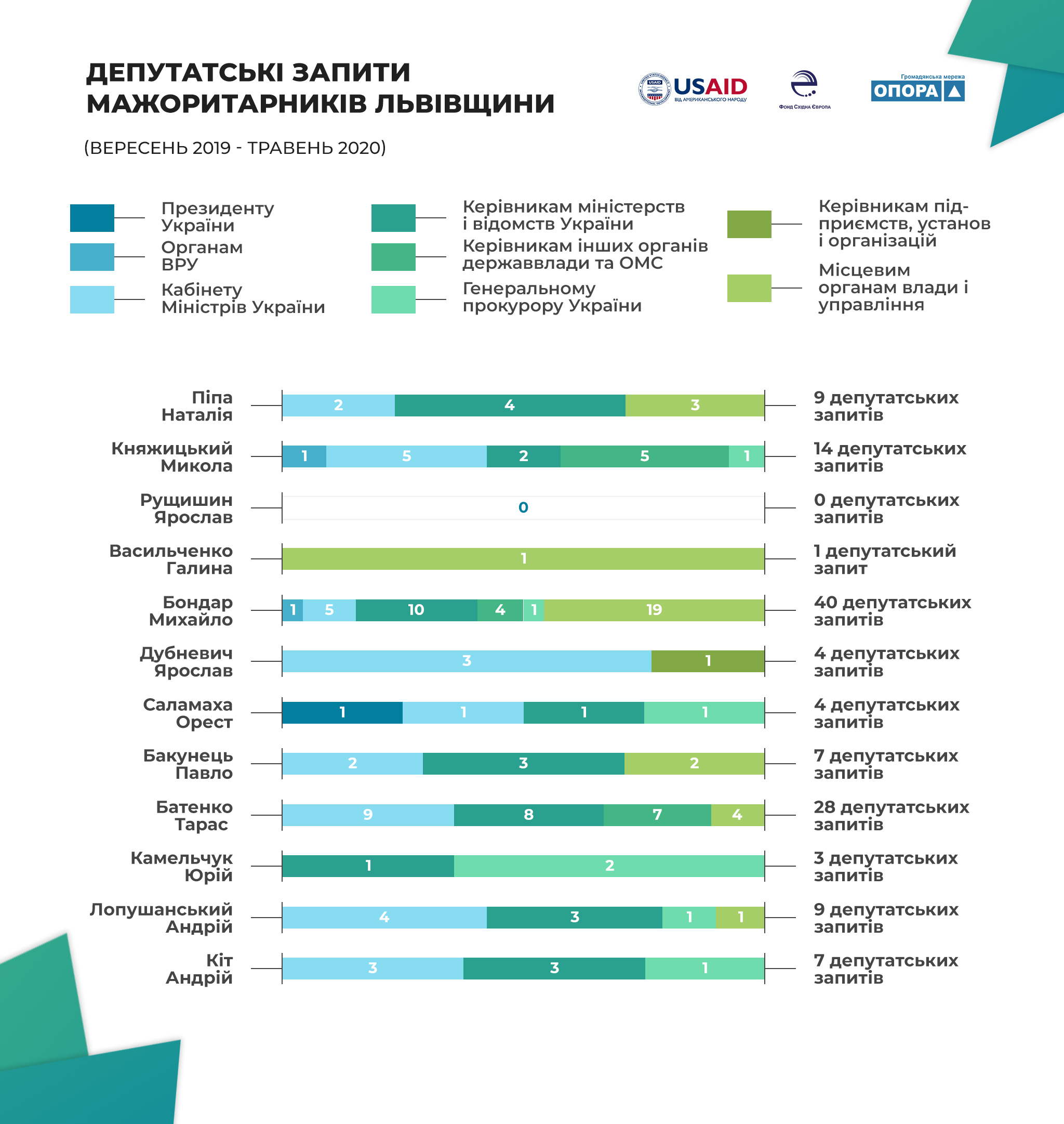 За період із вересня 2019 по травень 2020 року львівські мажоритарники 126 разів зверталися з депутатськими запитами. Найчастіше депутати адресували запити до Кабінету Міністрів України та керівникам міністерств та відомств України – 34 і 35 разів відповідно. Натомість жодного запиту не було скеровано до голови Верховної Ради та керівникам комітетів.