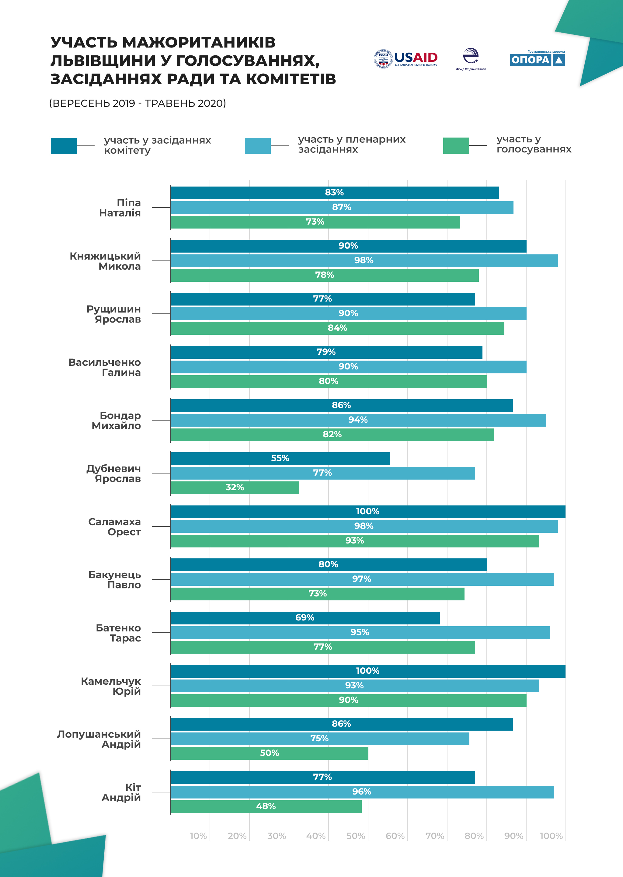 Проте дані електронної реєстрації на засіданнях Верховної Ради не дають можливості перевірити наскільки сумлінно обранці виконують обов’язок участі у голосуваннях. Адже існує негативна практика ігнорування голосувань незважаючи на присутність на пленарному засіданні. Таким чином, поряд із показником відвідування пленарних засідань, ми враховуємо дані так званого активного голосування – сума усіх голосувань депутата “за”, “проти” і “утримався” за питання порядку денного. Загалом за період з вересня 2019 по травень 2020 року відбулось 3945 голосувань. Серед львівських мажоритарників найвищий показник активного голосування мають Орест Саламаха (93%) і Юрій Камельчук (90%). Високі показники також у Ярослава Рущишина (84%), Михайла Бондаря (82%) та Галини Васильченко (80%). Далі йдуть Микола Княжицький (78%), Тарас Батенко (77%), Наталія Піпа (73%) і Павло Бакунець (73%). Найнижчі показники активного голосування мають трьоє народних мажоритарників Львівщини, а саме: Андрій Лопушанський (50%), Андрій Кіт (48%) і Ярослав Дубневич (32%). На основі цих даних можемо дійти висновку про те, що незважаючи на те, що 10 львівських мажоритарників реєструються на більше як 90% пленарних засіданнях, проте лише у 5-ти з них показники участі у голосуваннях становлять більше 80%, а у трьох — навіть нижче 50%.
