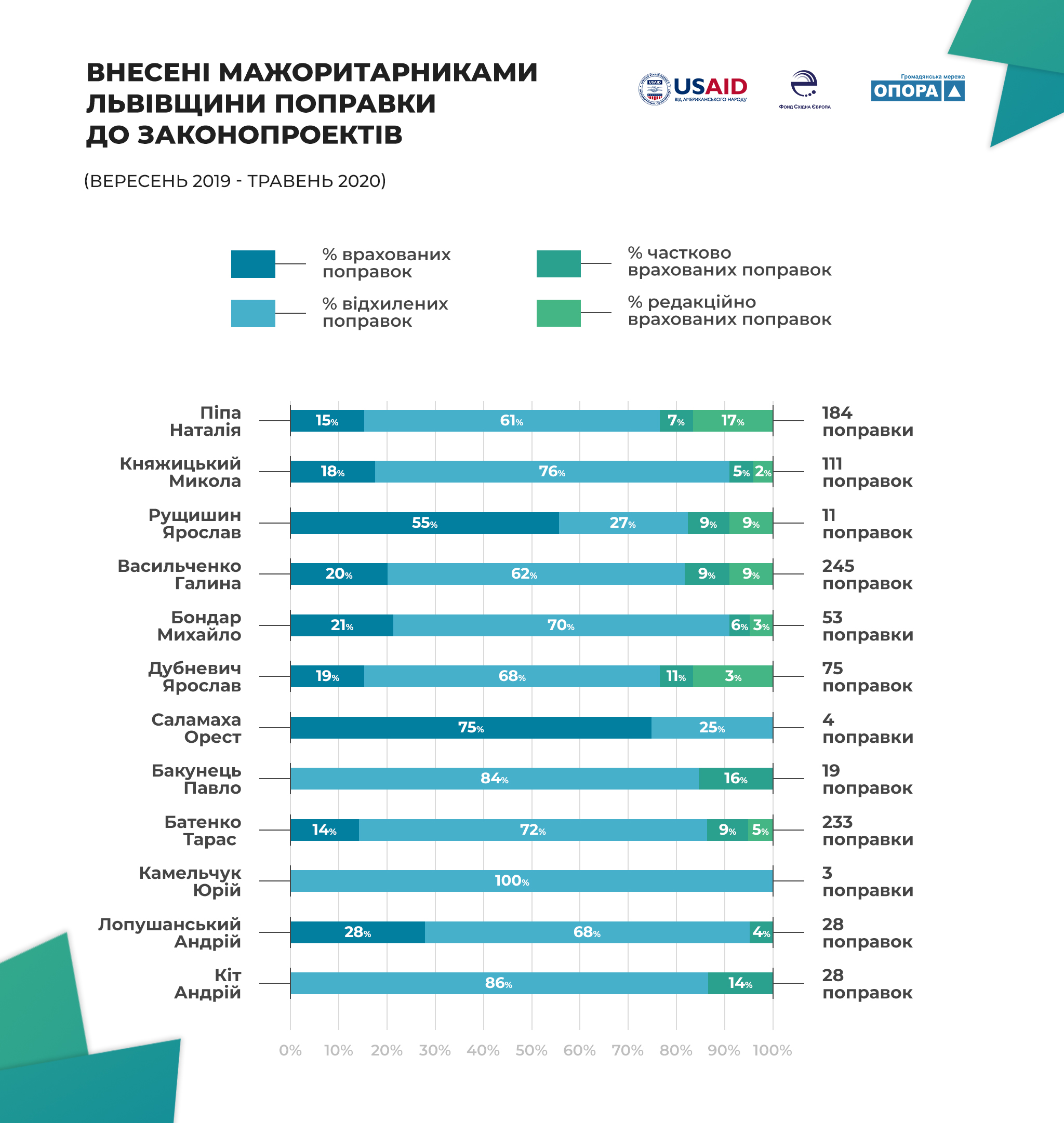 Внесення поправок до законопроєктів є невід’ємною частиною законотворення. Так, за підсумками 9 місяців роботи в парламенті, народними депутатами-мажоритарниками було внесено 994 поправки до законопроєктів, з яких 17% було враховано під час розгляду законопроєктів, 8% враховано частково, а 7,5% враховано редакційно. 67% поправок львівських депутатів-мажоритарників було відхилено.