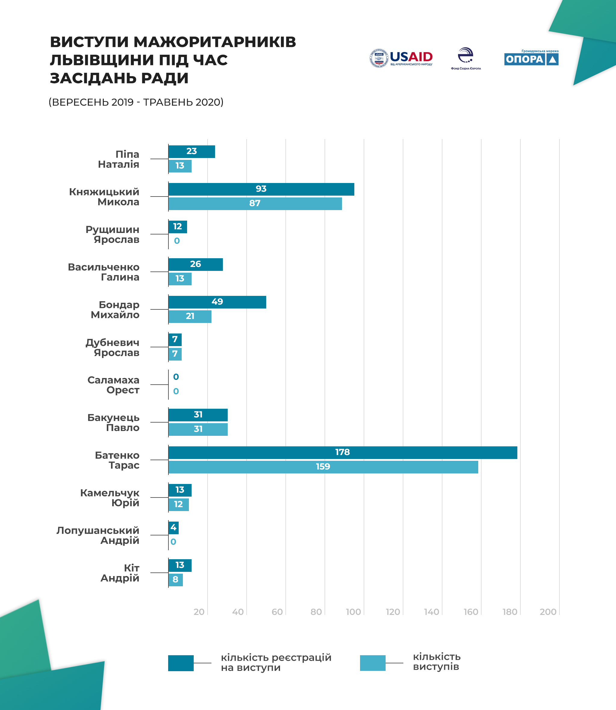 Серед львівських депутатів-мажоритарників найактивніше правом виступу користується Тарас Батенко, який 178 разів реєструвався для виступу, тоді як за даними стенограм, правом виступу скористався 159 разів. Така активність перш за все пов’язана з виконання ним функцій голови депутатської групи “За майбутнє”, що нещодавно оформилася у політичну партію. Микола Княжицький 93 рази реєструвався на виступ (87 скористався цим правом), Михайло Бондар — 49 (виступив 21 раз), Павло Бакунець реєструвався та скористався правом на виступ 31 раз, Галина Васильченко – 26 (виступила 13 разів), Наталія Піпа — 23 (виступила 13 разів). По 13 разів реєструвались для виступу Юрій Камельчук і Андрій Кіт, виступиши при цьому 12 і 8 разів відповідно. Ярослав Дубневич реєструвався для виступу і виступив 7 разів. Ярослав Рущишин 12 разів реєструвався для виступу, тоді як Андрій Лопушанський – 4, при цьому жодного разу це право вони не скористались. Орест Саламаха протягом перших 9 місяців роботи парламенту жодного разу не брав слова під час пленарних засідань Верховної Ради. Сумарно мажоритарники Львівщини 449 разів реєструвалися на виступ, але у 351 випадках брали слово.