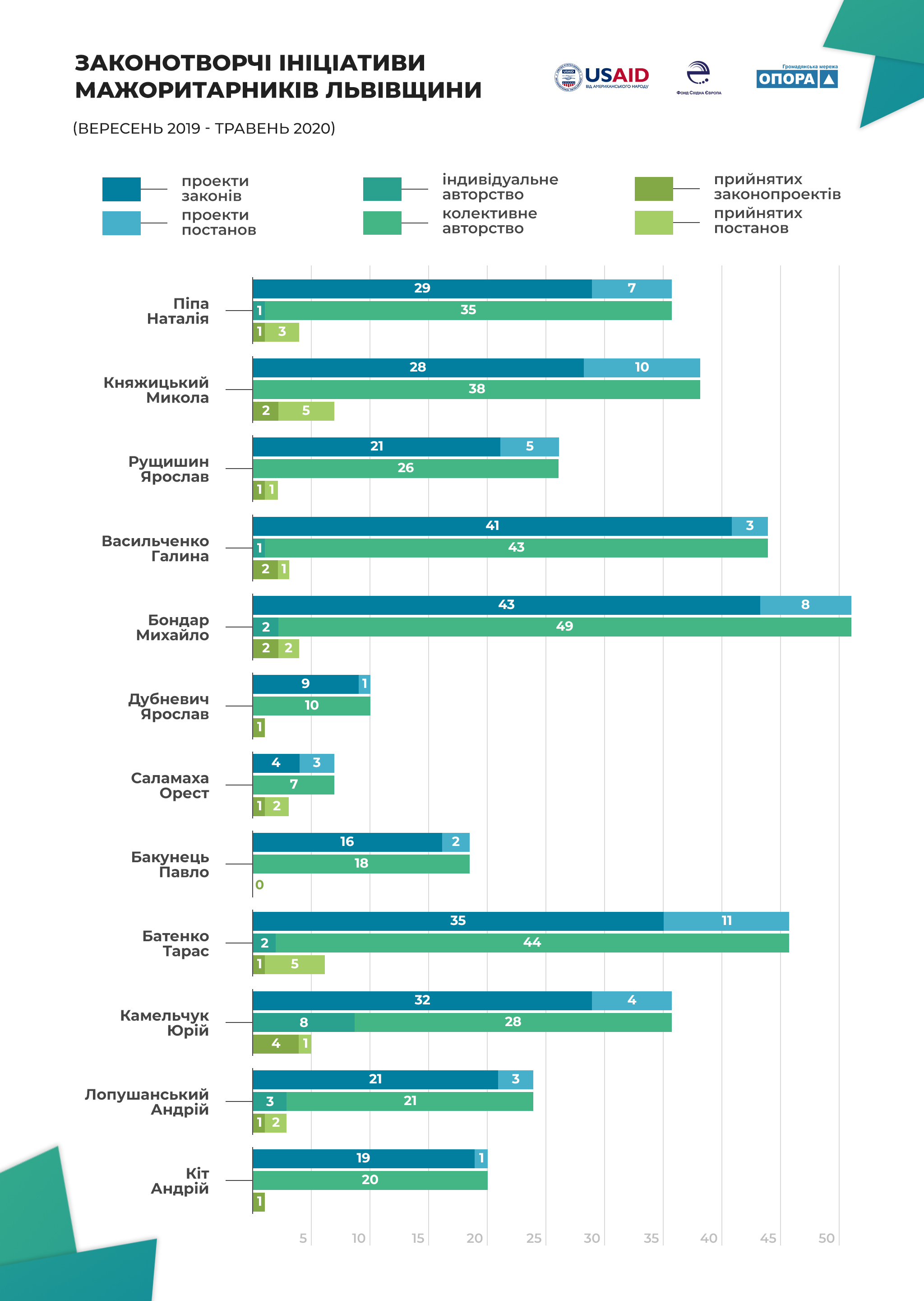 Водночас коефіцієнт корисної дії законотворчої діяльності львівських мажоритарників становить неповних 11% і перш за все завдяки прийнятим постановам. Лише 17 з 298 законопроєктів (6%), до яких мали відношення обранці Львівщини, набули чинності та стали законодавчими актами, тоді як у випадку проєктів постанов цей показник становить аж 38% (22 з 58 постанов були прийняті парламентом). Таким чином можна констатувати, що проблема непродуктивності законотворчої діяльності народних депутатів надалі залишається актуальною і львівські обранці є частиною проблеми т. зв. “законодавчого спаму”. Обіцянка правлячої партії змінити принцип законотворчої роботи на “two out, one in” (на кожен прийнятий законопроєкт два відхилення) не виконується.