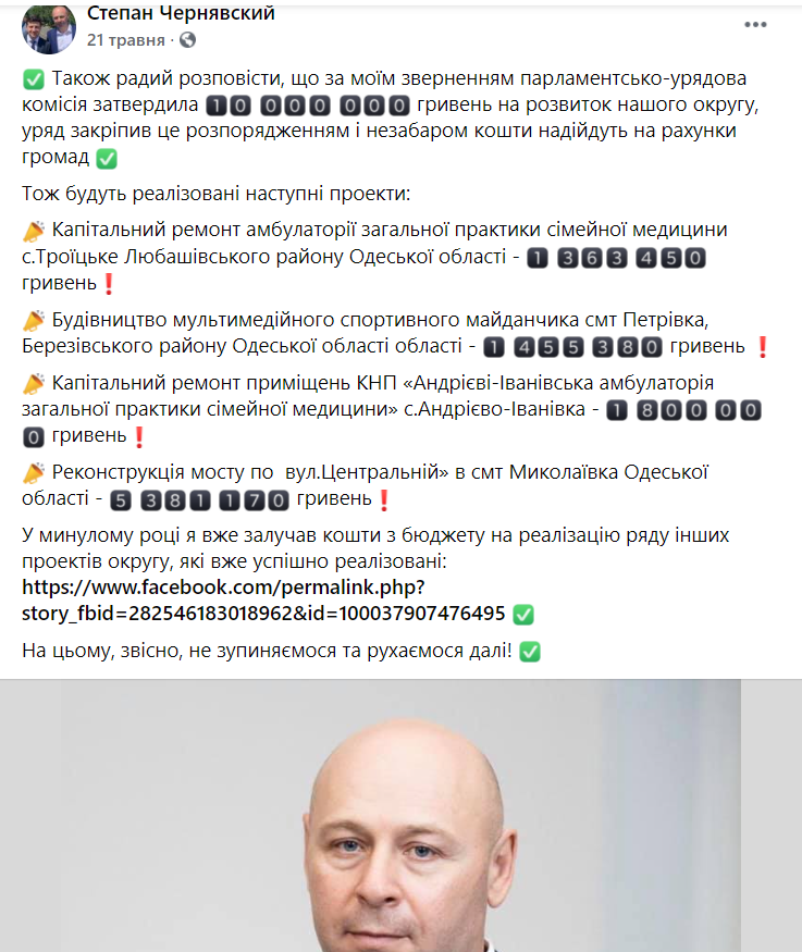 Округ Степана Чернявського (Ананьївський, Березівський, Іванівський, Любашівський, Миколаївський, Ширяївський райони, частина Лиманського району) отримав чотири субвенції на 10 млн грн: