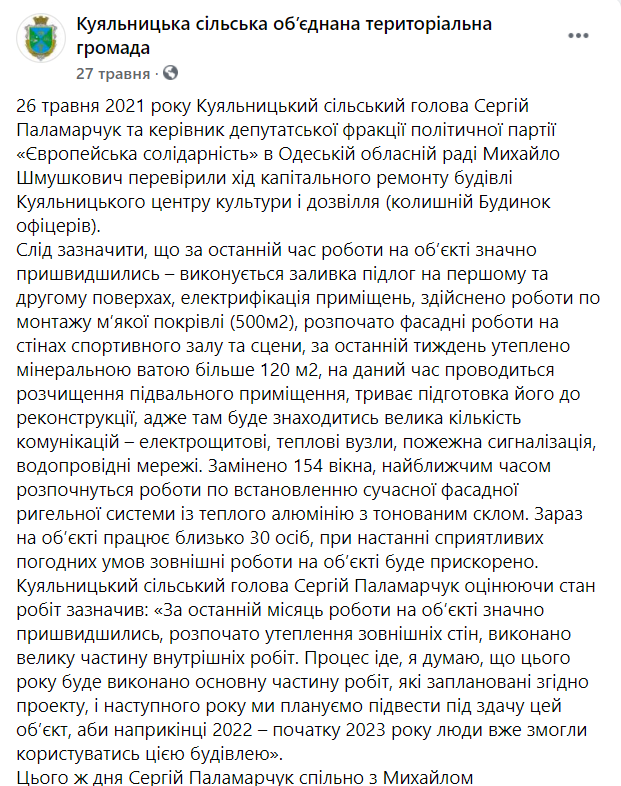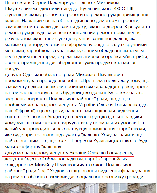 27 березня на сторінці у Facebook Куяльницької ОТГ був оприлюднений допис про капітальний ремонт будівлі Куяльницького центру культури і дозвілля. Наприкінці допису висловлена подяка народному депутатові Олексію Гончаренку за ініціювання виділення коштів на ремонт.