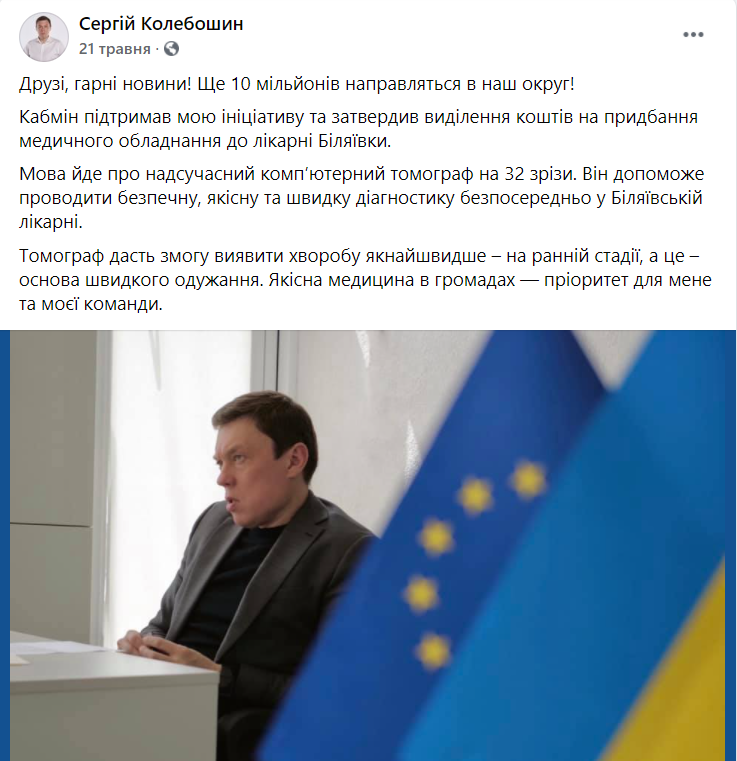 На округ Сергія Колебошина (міста Теплодар, Чорноморськ, Овідіопольський район, частина Біляївського району) виділено 10 млн грн на одну субвенцію – на придбання мультизрізового комп’ютерного томографа на 32 зрізи з інжектором та принтером для Біляївської багатопрофільної лікарні.