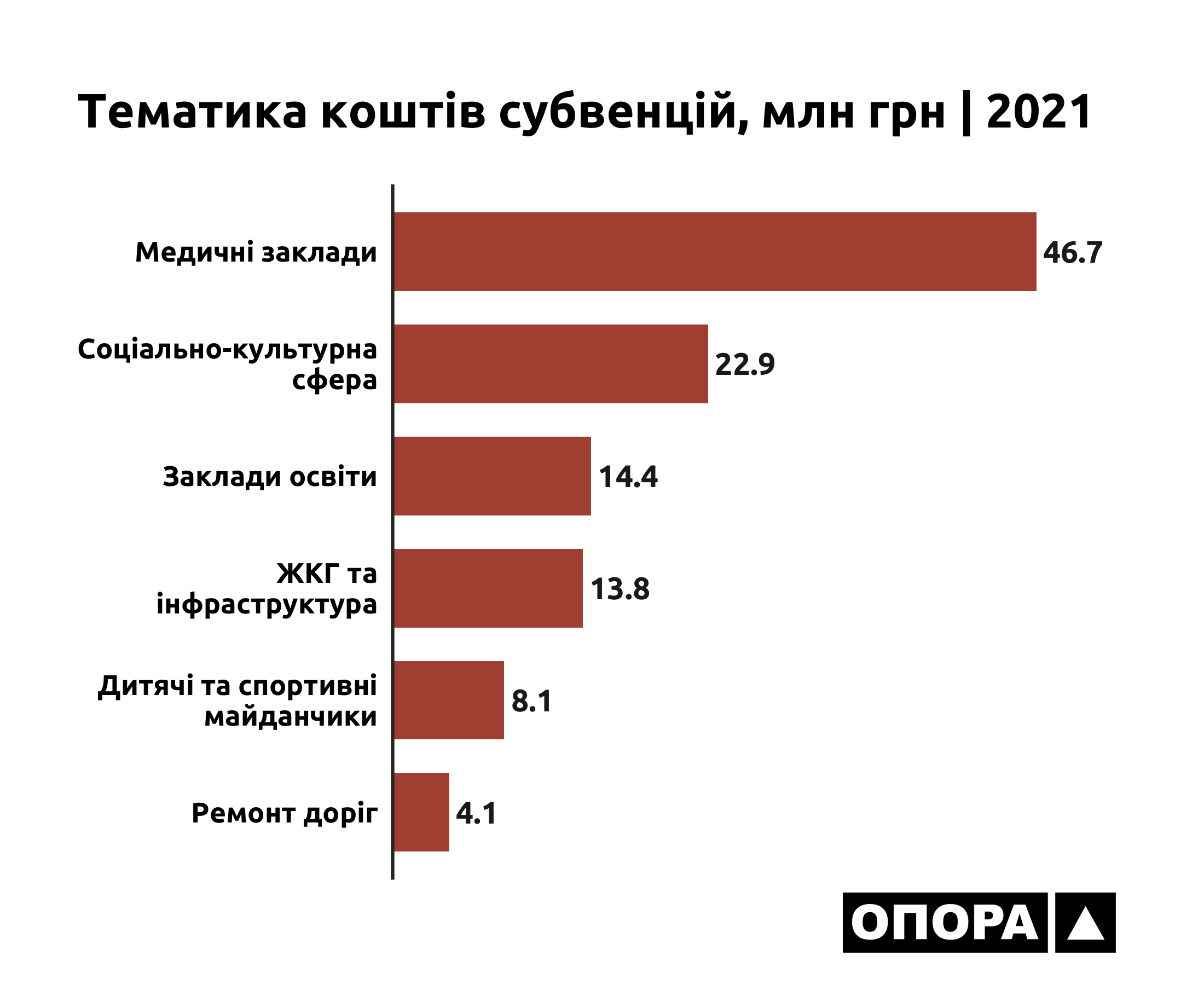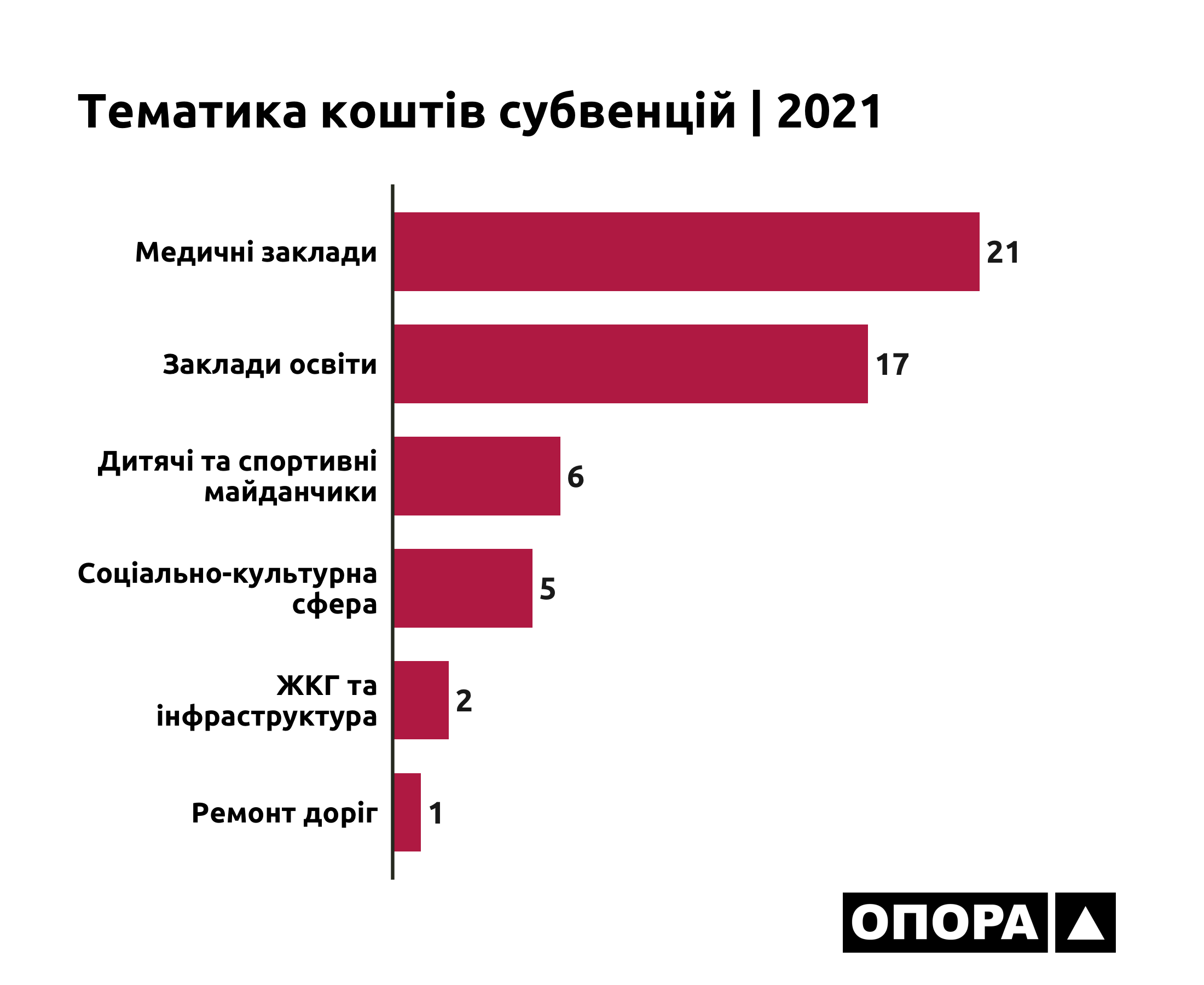 Найбільшу кількість субвенцій в Одеській області отримали медичні заклади (21 об’єкт) та заклади освіти (17), а найменше – сфера ЖКГ та інфраструктури (два) і ремонт доріг (один).