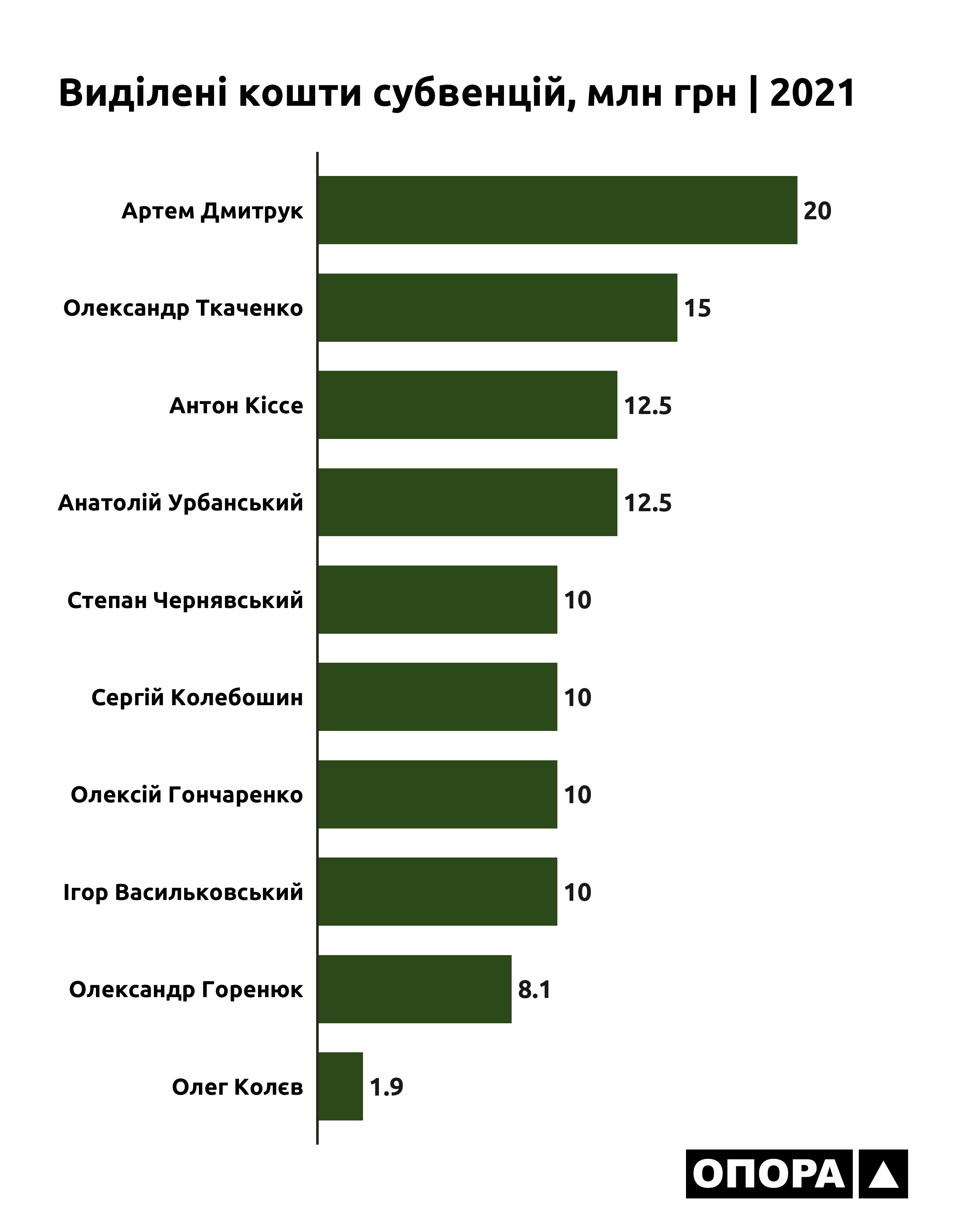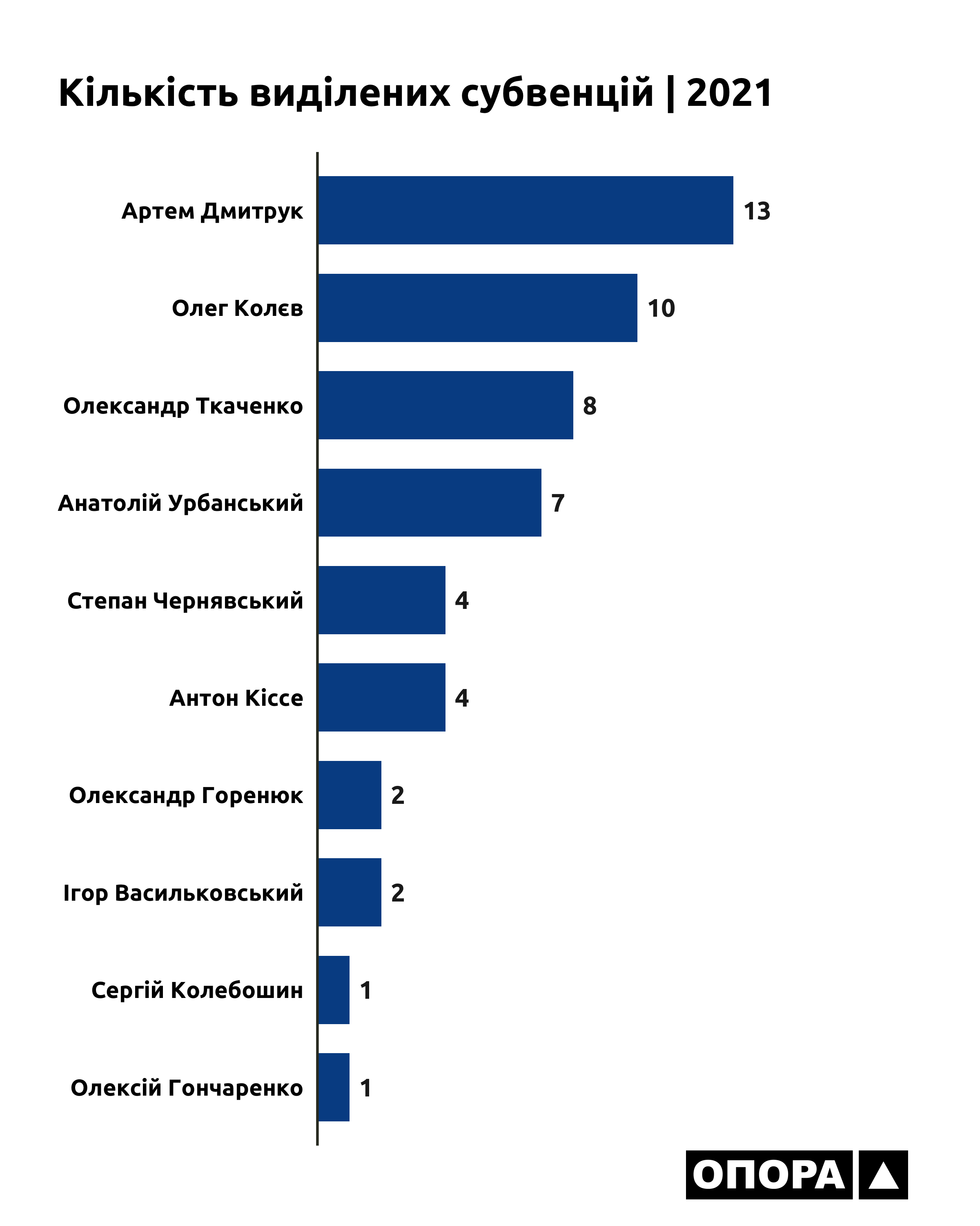 Найбільшу кількість субвенцій в Одеській області отримали округи народних депутатів Артема Дмитрука (13 об’єктів) та Олега Колєва (10). Найменше ж субвенцій в округах Сергія Колебошина та Олексія Гончаренко – по одній.