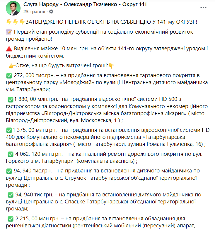 Про виділення коштів субвенції на округ Олександр Ткаченко повідомив на своїй сторінці у соціальній мережі Facebook. Народний депутат жодним чином не зауважив на своїй ролі в виділенні коштів на округ.
