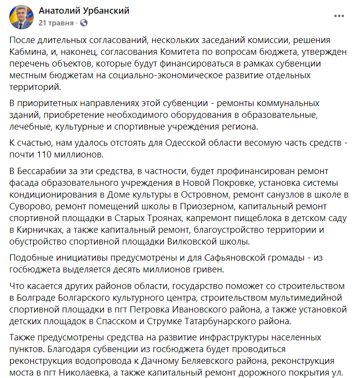 Про виділення коштів субвенції з державного бюджету Анатолій Урбанський написав у своєму Facebook 21 травня: депутат зазначив, що вдалося відстояти для Одеської області 110 млн грн.