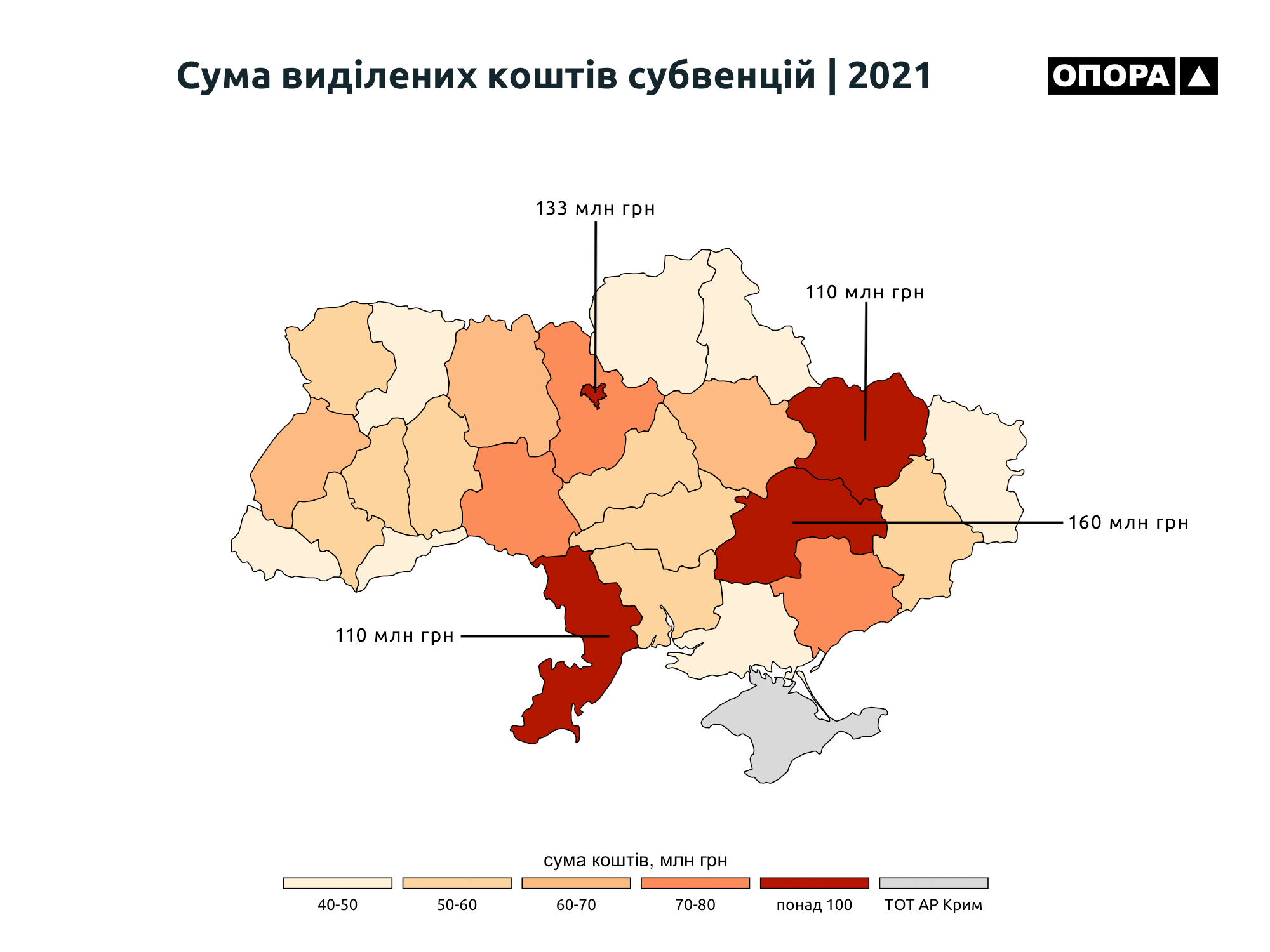 Найбільше коштів субвенції із державного бюджету на соціально-економічний розвиток отримали Дніпропетровська область (160 млн грн), м. Київ (133 млн грн), Харківська (110 млн грн) та Одеська (110 млн грн) області. Про це свідчать результати дослідження ОПОРИ.