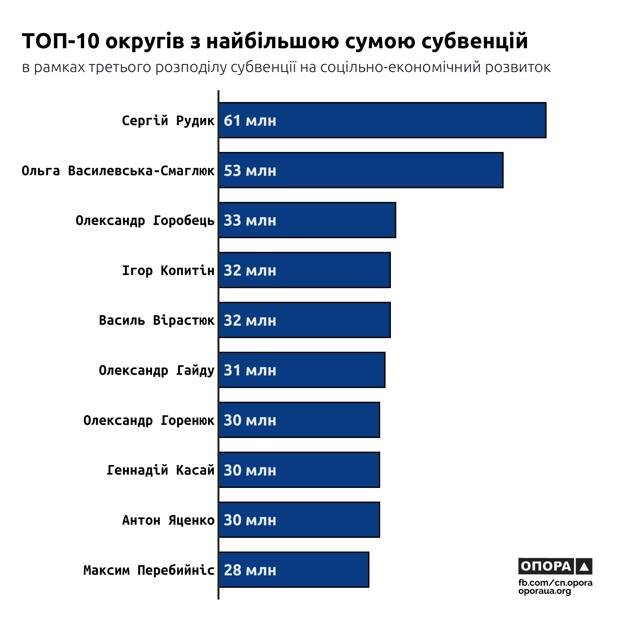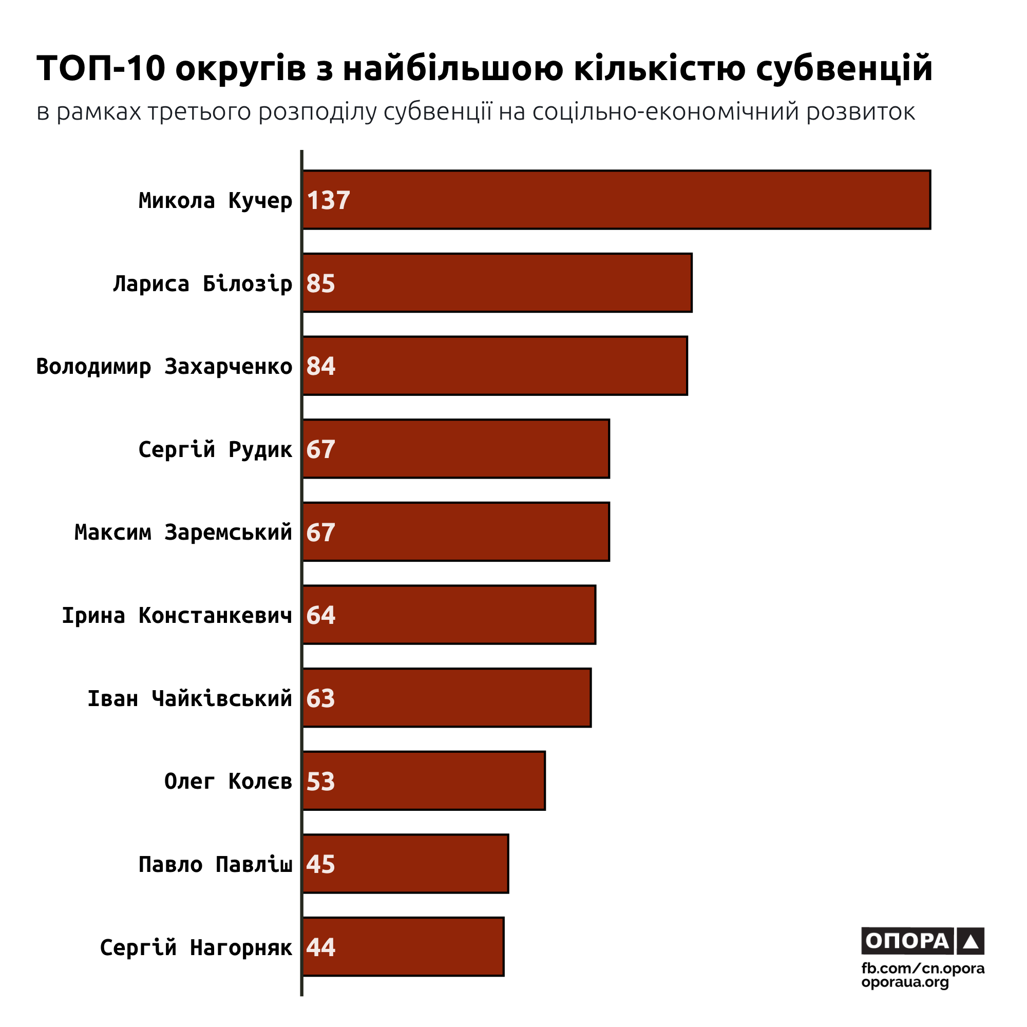 Хто отримав найбільше. Найбільше коштів спрямували на округ Сергія Рудика (група “За майбутнє”), що на Черкащині, — 61 млн 181 тис. грн. На другому місці — округ Ольги Василевської-Смаглюк (“Слуга народу”) на Київщині, який отримав 53 млн 316 тис., на третьому — округ Олександра Горобця (“Слуга народу”) в Київській області, куди виділили 33 млн грн. Наступним є округ мажоритарника з Івано-Франківщини Василя Вірастюка (“Слуга народу”), який отримав 32 млн 199 тис. Першу п'ятірку замикає округ депутата з Миколаївщини Ігоря Копитіна (“Слуга народу”), на який спрямовано субвенцій на 32 млн.