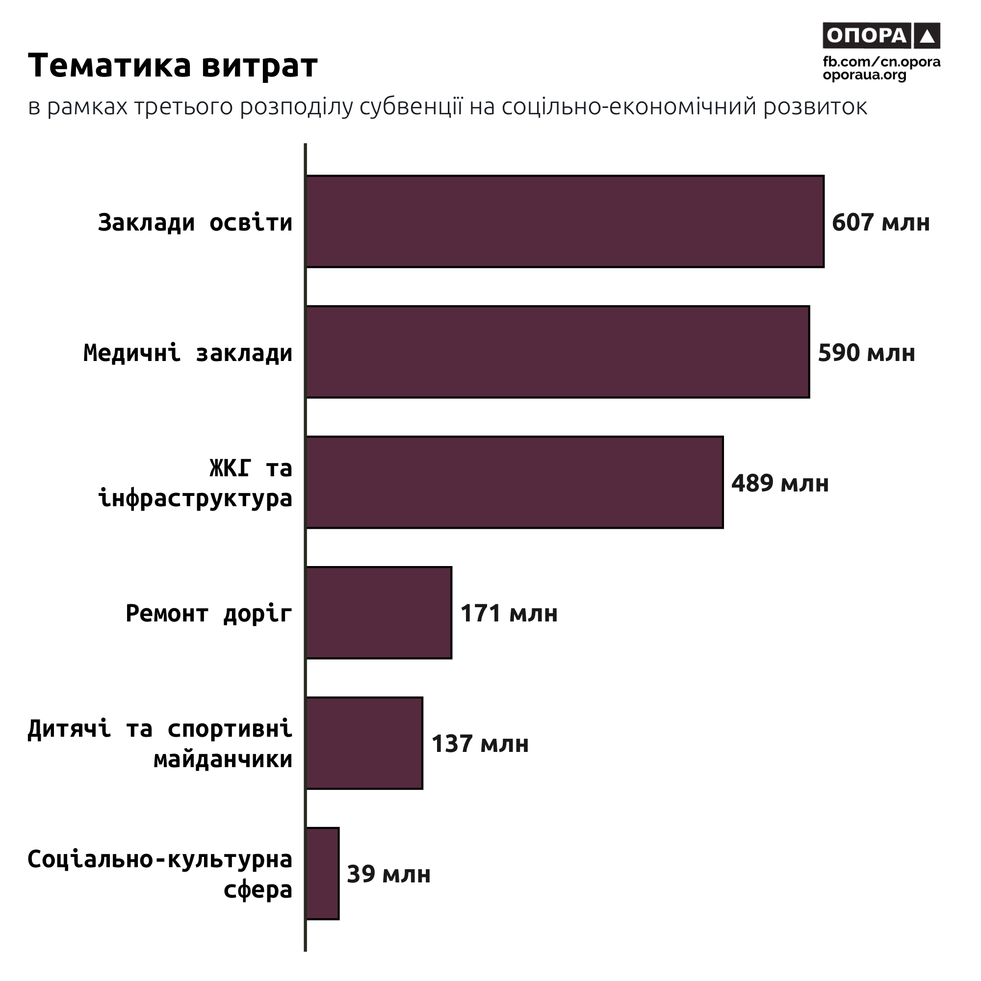 Під час третього розподілу субвенцій найбільше коштів виділили на освітні заклади — 30% (близько 607 млн). На другому місці опинилися медичні заклади — 29% (590 млн), на третьому — сфера ЖКГ та розвитку інфраструктури з 24% (майже 489 млн). На четвертому місці — ремонти доріг — 8% (171 млн). На дитячі та спортивні майданчики спрямували майже 137 млн грн (7%), а на соціально-культурну сферу — майже 38 млн грн (2%).