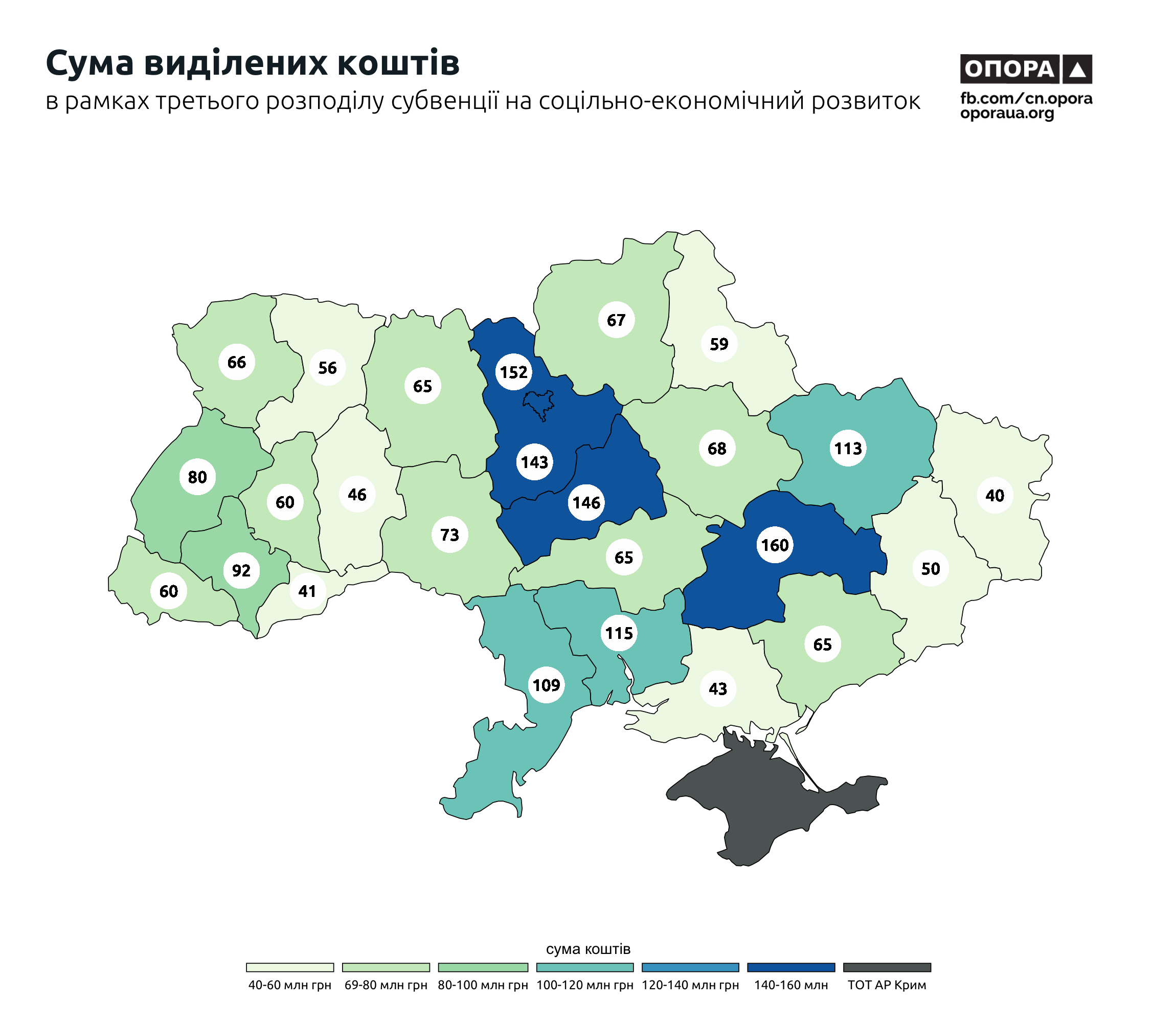Найбільше грошей спрямували до Дніпропетровської області (160 млн грн), міста Києва (майже 152 млн грн), а також до Черкаської (146 млн грн) й Київської (143 млн грн) областей.