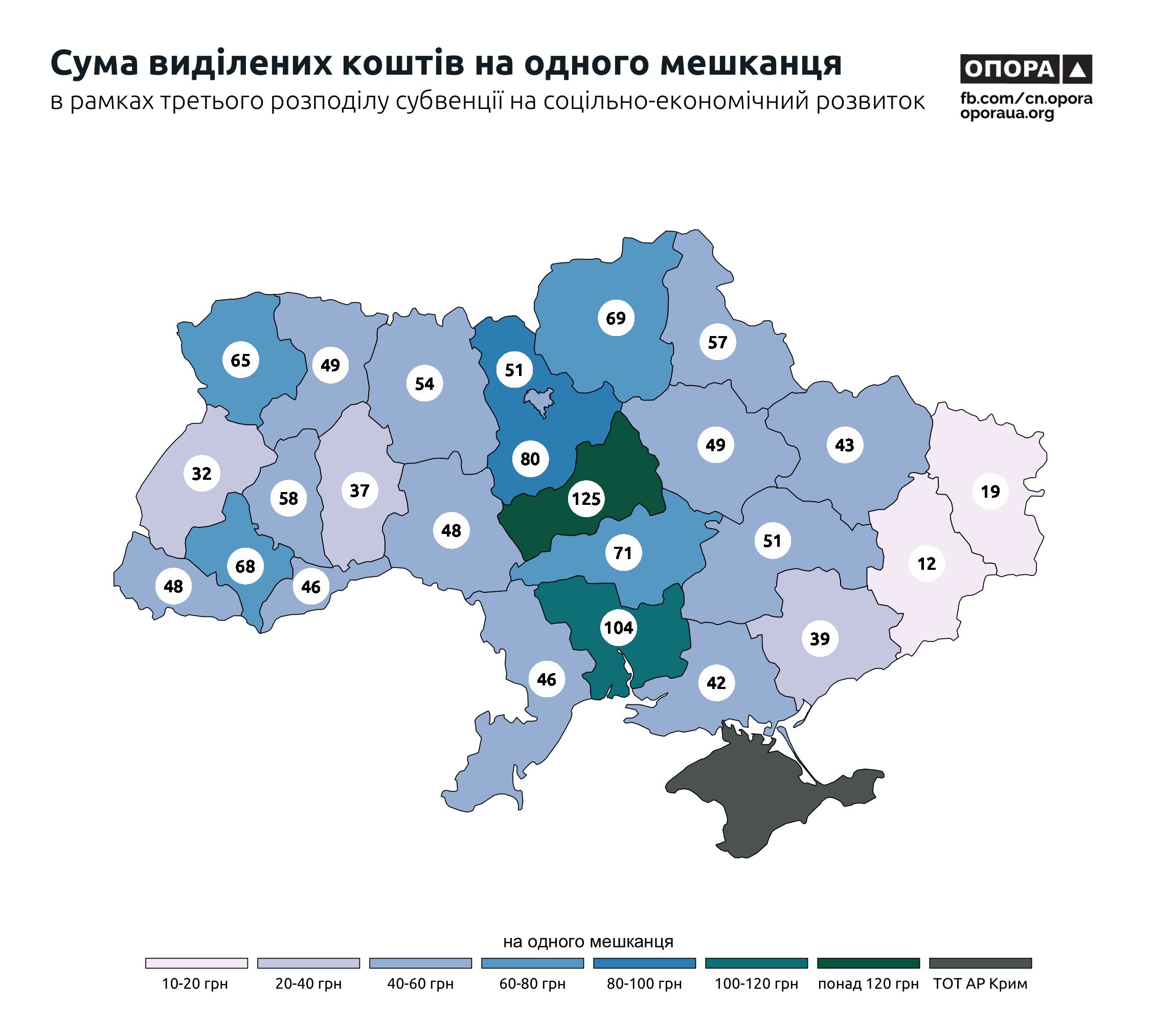 Так, на одного мешканця Черкаської області виділили 124 грн, Миколаївської – 104 грн, Київської — 80 грн. Водночас на одного жителя Донецької області припадає 12 грн, Луганської — 18 грн, а Львівської — 32 грн. І якщо кількість населення Донецької та Луганської областей, згідно з даними Держстату, може бути завищеною або ж ці області можуть фінансуватися з інших державних програм, то питання де-факто недофінансування Львівської області залишається відкритим. Важливо, що ще минулоріч Львівщина входила в топ-5 регіонів-отримувачів субвенцій.