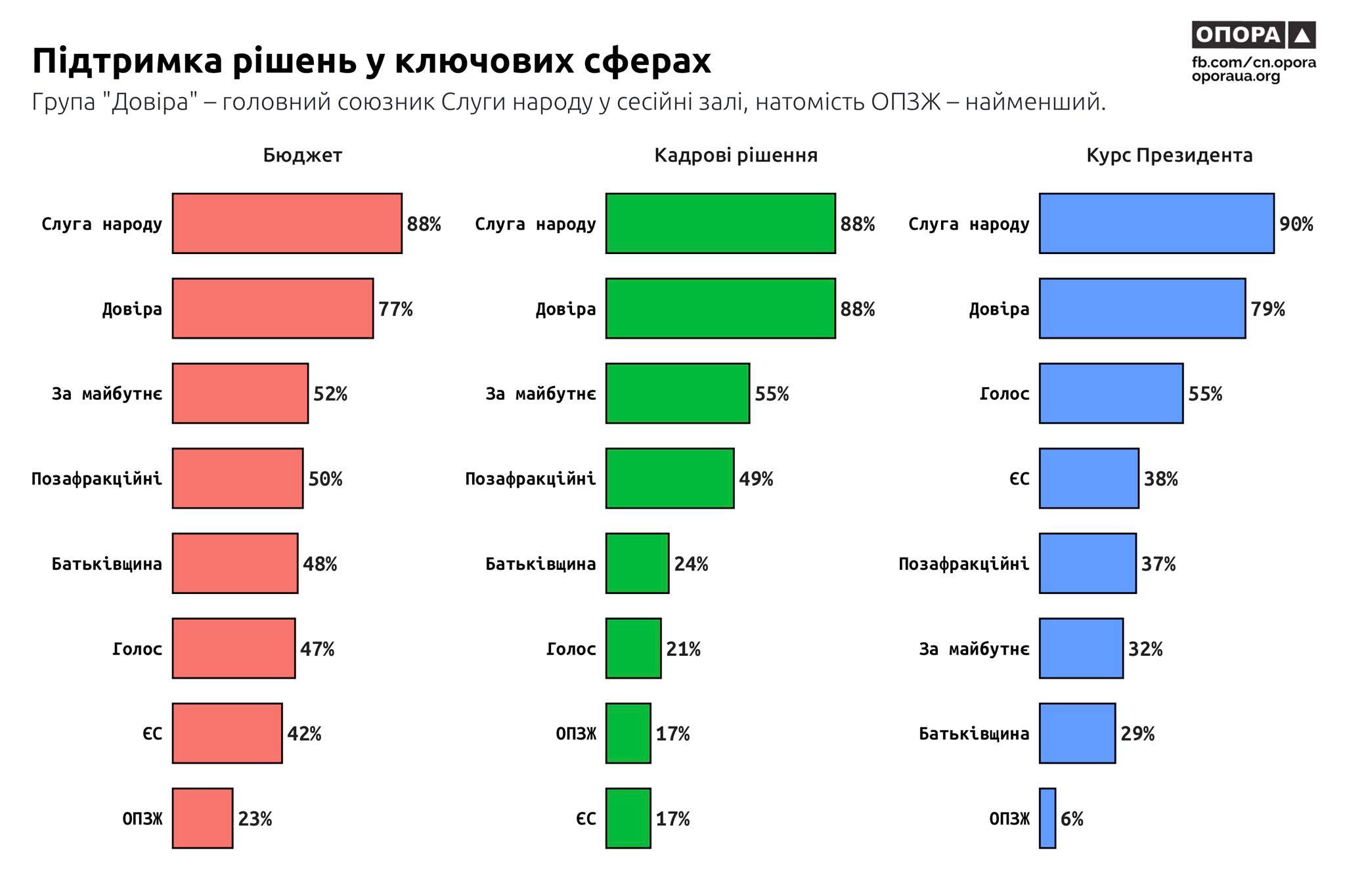 Щоб отримати субвенцію на округ, найвигідніше були мажоритарником у “Слузі народу”, групах “Довіра“ та “Партія ‘За майбутнє’”, а також фракціях “Батьківщина” та “Голос”. Згідно з даними дослідження ОПОРИ, групи “Довіра” та “За майбутнє” є ключовими союзниками “Слуги народу” під час голосувань за кадрові рішення, бюджет та законопроєкти, спрямовані на реалізацію курсу Президента.