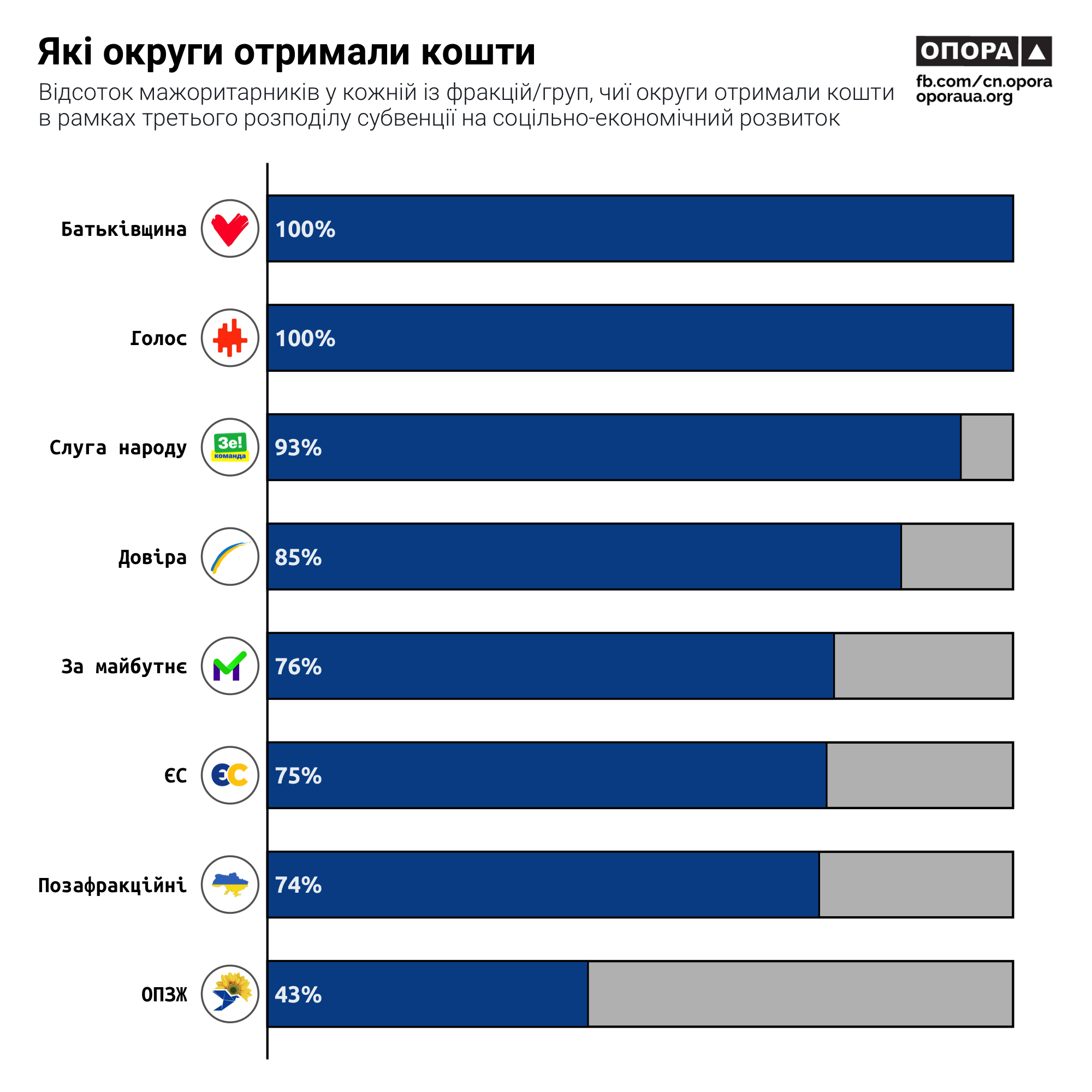 Третій розподіл не став винятком і підтвердив усі тенденції та проблеми цього процесу. Він залишається непрозорим і нерівномірним, а вирішальний вплив на нього мають народні депутати. Найбільше коштів отримують округи депутатів “Слуги народу” та лояльних до неї політичних сил (група “Довіра”, група “Партія ‘За майбутнє’”, частково “Голос”), а також тих, хто голосує синхронно з монобільшістю (Антон Яценко та Олег Мейдич із “Батьківщини”).