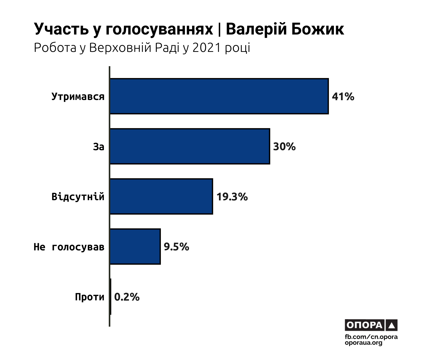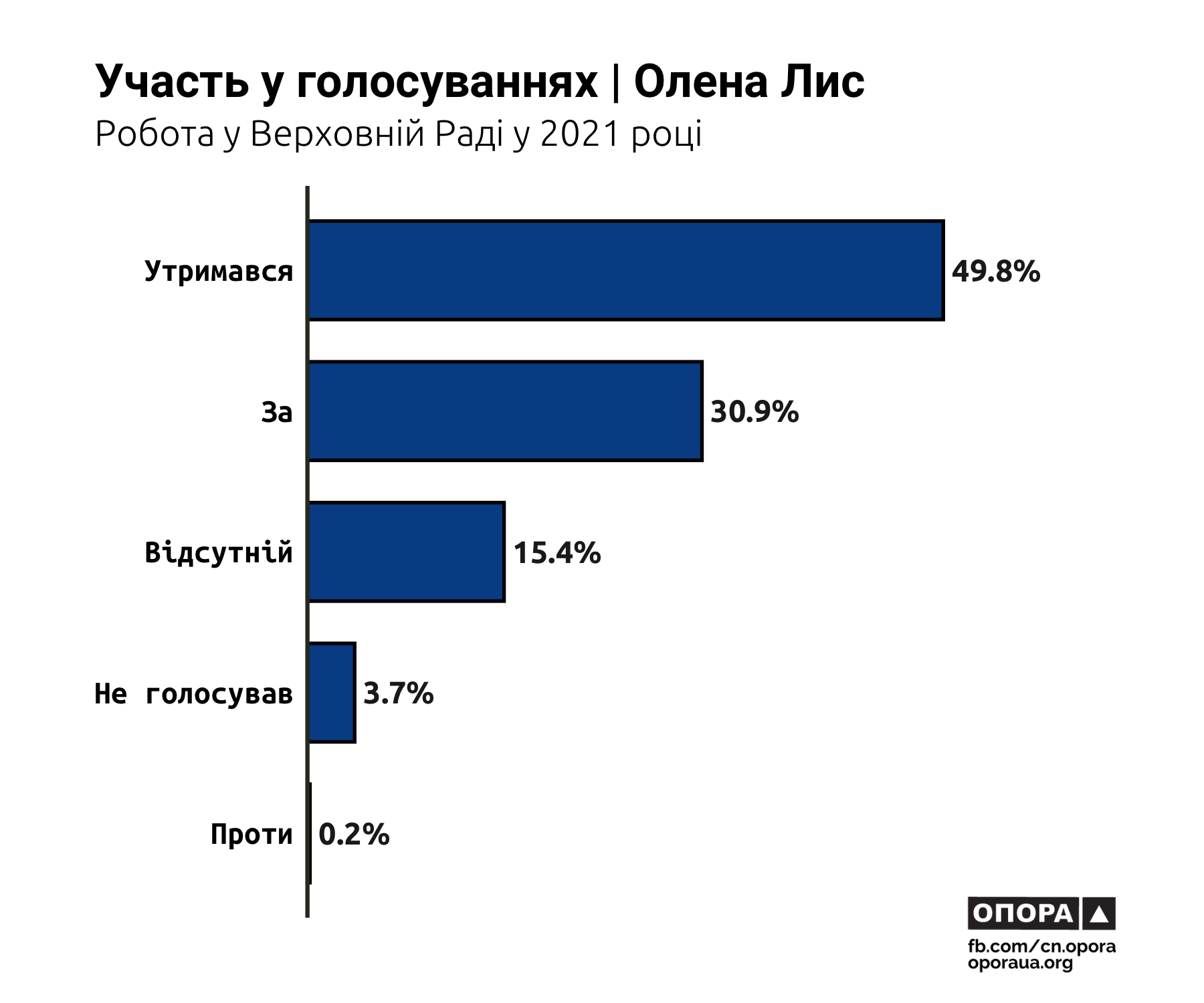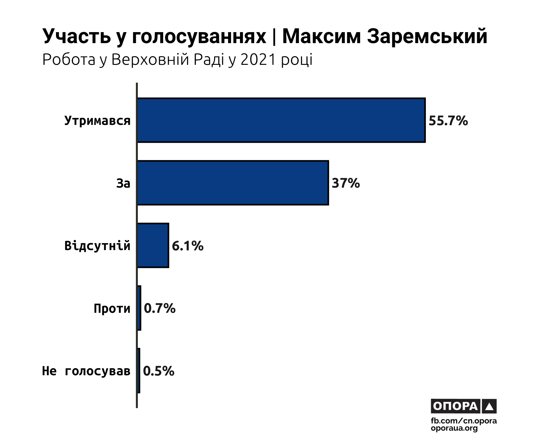 Найбільше голосувань у 2021 році пропустив Валерій Божик. Він був відсутній під час 19,3% голосувань, а ще у 9,5% випадків — не голосував, перебуваючи у парламенті. Дещо менший відсоток пропусків в Олени Лис. Вона була відсутня під час 15,4% голосувань, а ігнорувала їх у 3,7% випадків. Максим Заремський пропустив 6,1% голосувань, а не голосував, маючи таку можливість, у 0,5% випадків. Найменше голосувань пропустив Георгій Мазурашу — 1,8% та 0,5% відповідно.
