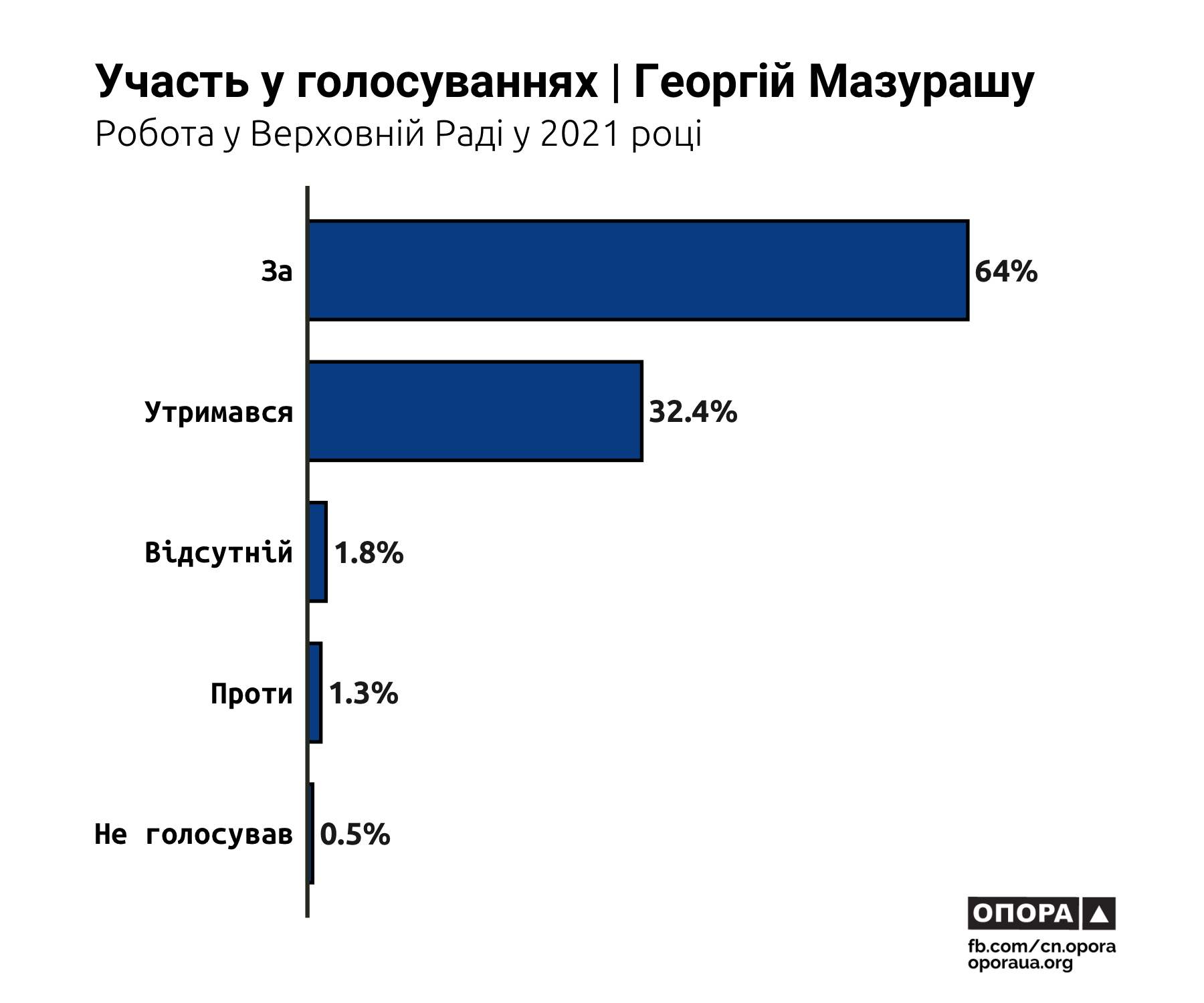 Георгій Мазурашу — єдиний із буковинських мажоритарників, який у парламенті здебільшого голосував “за” (64%). Утримувався він лише у третині випадків (32,4%), хоча решта мажоритарників області надавали перевагу саме такому варіанту. Найчастіше це робив Максим Заремський — у 55,7% випадків. Олена Лис утрималася під час 49,8% голосувань, Валерій Божик — під час 41%. Відповідно, відсоток голосів “за” у всіх трьох значно менший: у Максима Заремського — 37%, в Олени Лис — 30,9%, у Валерія Божика — 30%.
