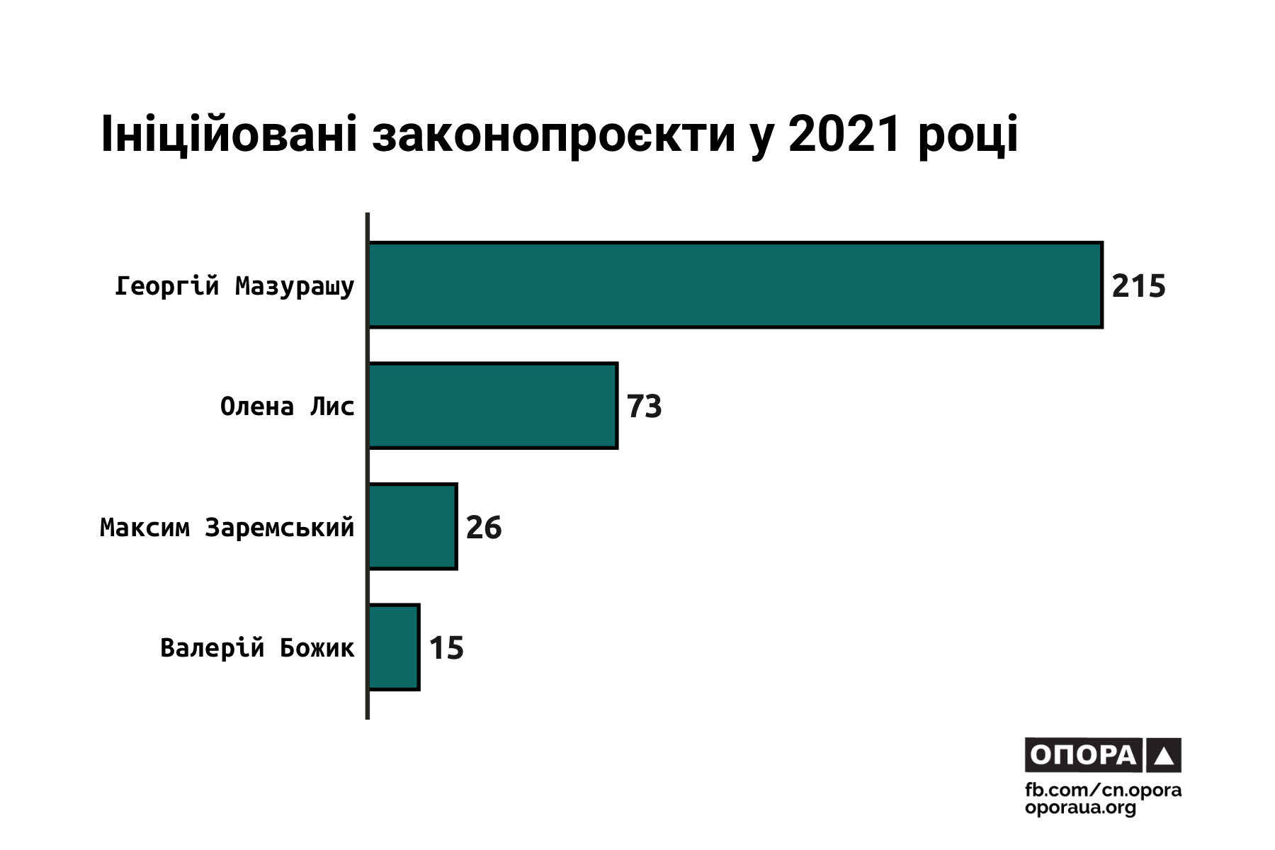 Найбільша кількість ініційованих законопроєктів в активі Георгія Мазурашу — 215. За цим показником він очолив загальнопарламентський рейтинг. Кількість законодавчих ініціатив інших буковинських мажоритарників скромніша. Олена Лис долучилася до ініціювання 73 законопроєктів, Максим Заремський — 26, а Валерій Божик — 15.