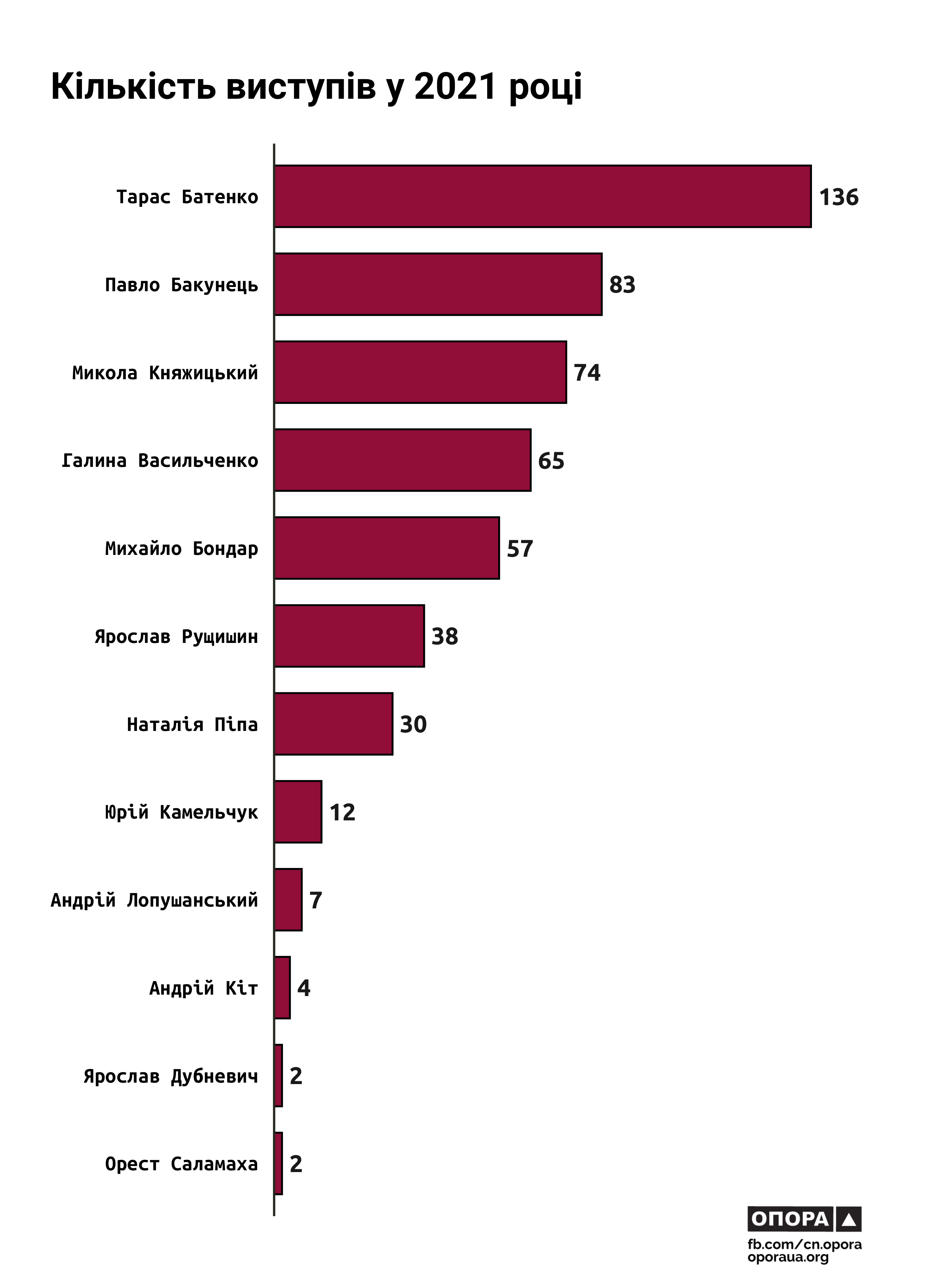 Найменше скористалися своїм правом на виступ Андрій Лопушанський, який витратив 38 секунд для коротких реплік, Орест Саламаха (2 рази тривалістю 2 хвилини), Остап Шипайло (разовий виступ на 2 хвилини). Лише двічі брав слово Ярослав Дубневич (3 хвилини), по 4 рази виступали Андрій Парубій (11 хвилин) та Андрій Кіт (7хвилин), 5 разів — Мар’ян Заблоцький (4 хвилини) і 8 разів — Ростислав Тістик (7 хвилин). Тарас Козак, Євген Петруняк і Святослав Юраш жодного разу не брали слова у сесійній залі протягом 2021 року.