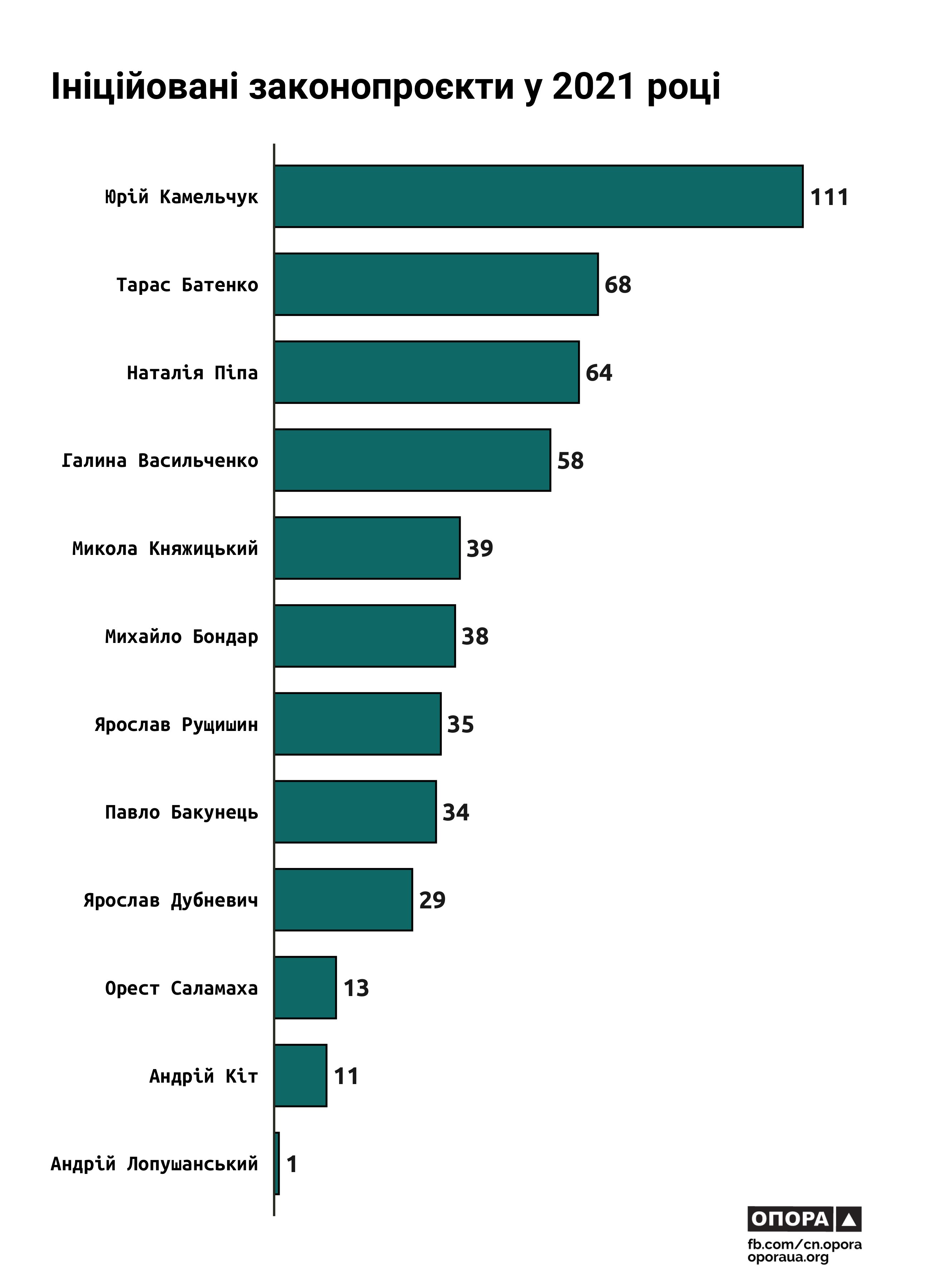Натомість більш показовим з погляду ефективності законотворчої діяльності є показник кількості та відсотків прийнятих законопроєктів. Найбільше таких ініціатив у 2021 році у представників правлячої партії Юрія Камельчука (13) та Євгена Петруняка (8). Далі — Ярослав Дубневич (5) і Наталія Піпа (5), за ними — Святослав Юраш, Галина Васильченко і Тарас Батенко, у яких по 3 прийнятих законопроєкти. По два чинних законопроєкти в активі Андрія Кота, Ореста Саламахи, Ростислава Тістика, Софії Федини, Ярослава Рущишина та Мар’яна Заблоцького. Своєю чергою, Павло Бакунець, Микола Княжицький і Роман Лозинський мають по одному прийнятому закону. Ще дев’ять львівських депутатів не мають жодного у 2021 році. Однак із погляду всієї поточної каденції ситуація дещо відрізняється, оскільки серед львівських обранців найбільше прийнятих законопроєктів у Юрія Камельчука (34), Ярослава Дубневича (17), Євгена Петруняка (17), Романа Лозинського (16), Мар’яна Заблоцького (16), Наталії Піпи (15), Галини Васильченко (15), Святослава Юраша (13) та Ярослава Рущишина (12).