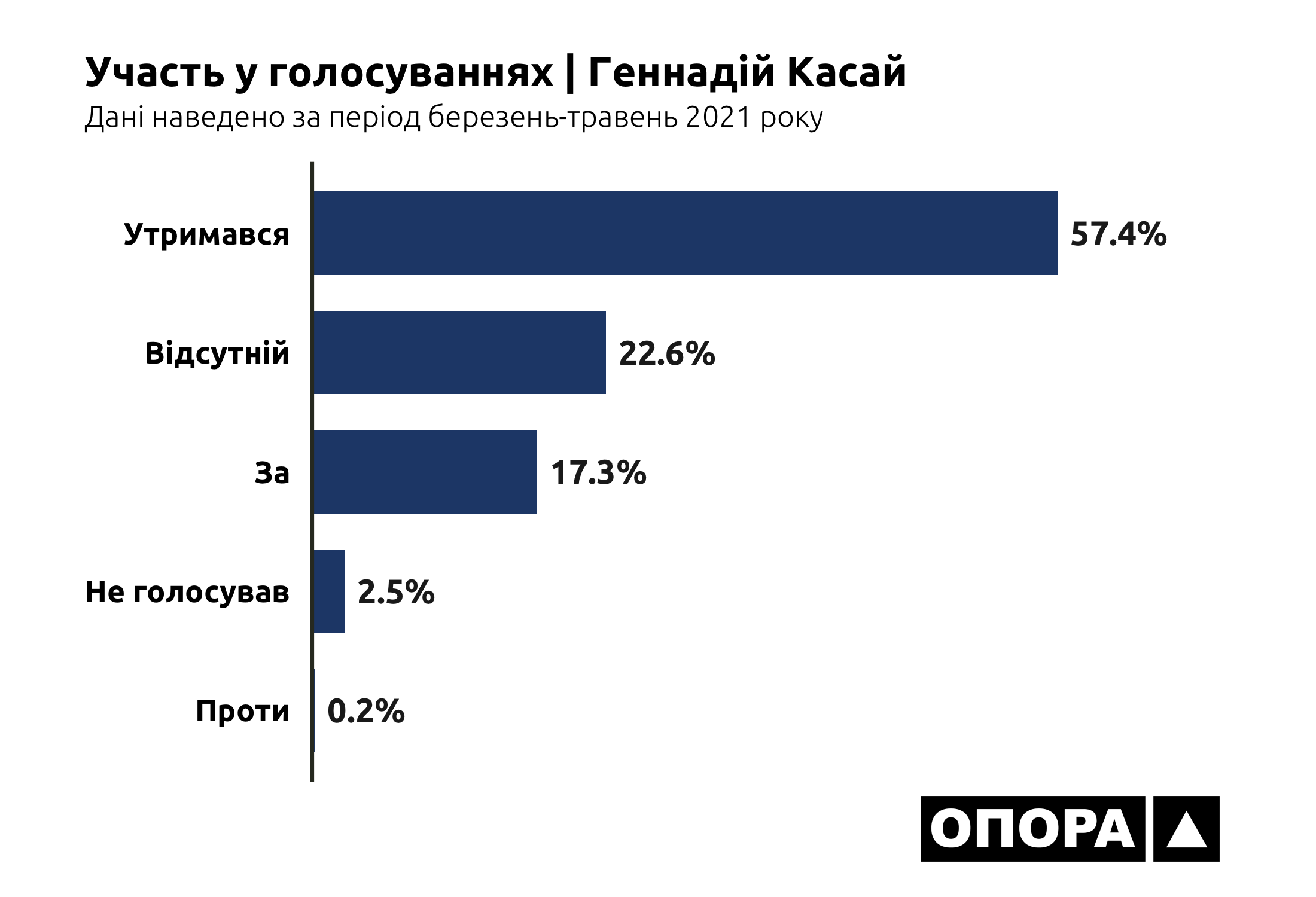 З часу набуття повноважень нардеп не голосував за ініціативи з декомунізації та створення на базі військових комісаріатів територіальних центрів комплектування та соціальної підтримки. Також з серпня 2019 року голосував 871 раз проти рішення фракції (врозріз із переважним рішенням інших членів своєї фракції), що складає 14% випадків. Генадій Касай брав участь у 76% голосувань з часу початку своєї каденції.