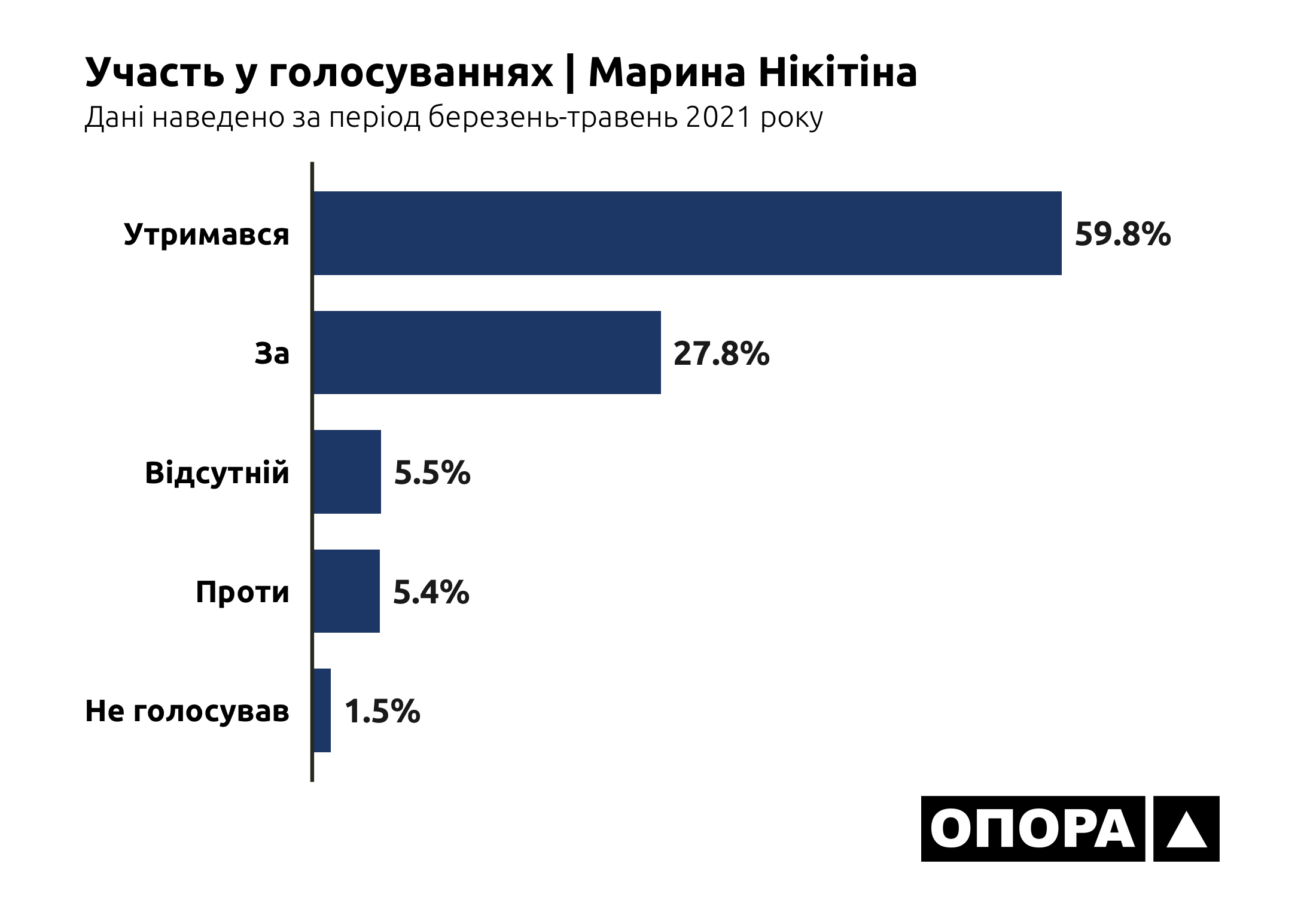 Громадянська мережа ОПОРА провела моніторинг активностей депутатів мажоритарників від Запорізької області у сесійній залі навесні 2021 року. Зокрема, у період з 1 березня по 31 травня включно їхня діяльність відстежувалася за участю у голосуваннях, законотворчими ініціативами та особливостями виступів.