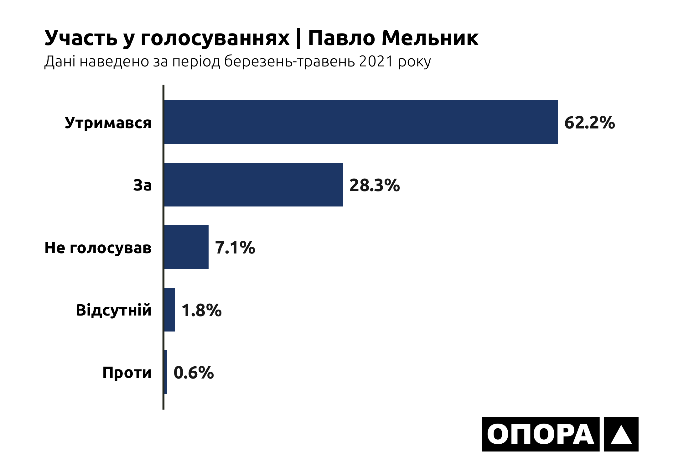 У сфері законодавчих ініціатив Павла Мельника з березня по травень були питання забезпечення місцевої пожежної охорони; захисту бджіл; судового контролю за виконанням судових рішень в адміністративних справах; оподаткування Міжнародного дитячого центру «Артек»; зменшення адміністративного навантаження на підприємницьку діяльність; умов прийому на навчання для здобуття вищої освіти; роботи цифрового мовлення українських ЗМІ в прифронтових територіях; надання електронних послуг, а також проєкт Закону про місцевий референдум.