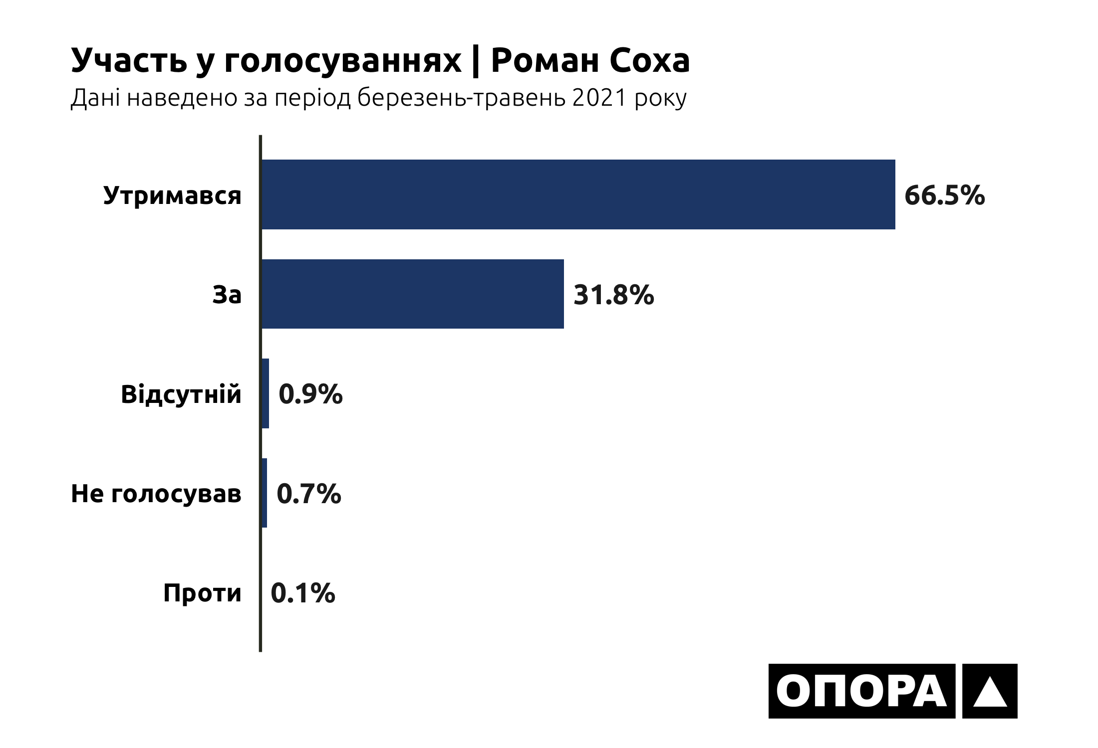 Роман Соха був присутнім під час голосування у сесійній залі у 95% випадках. Проти рішення фракції голосував 434 рази, що становить 5,5%.