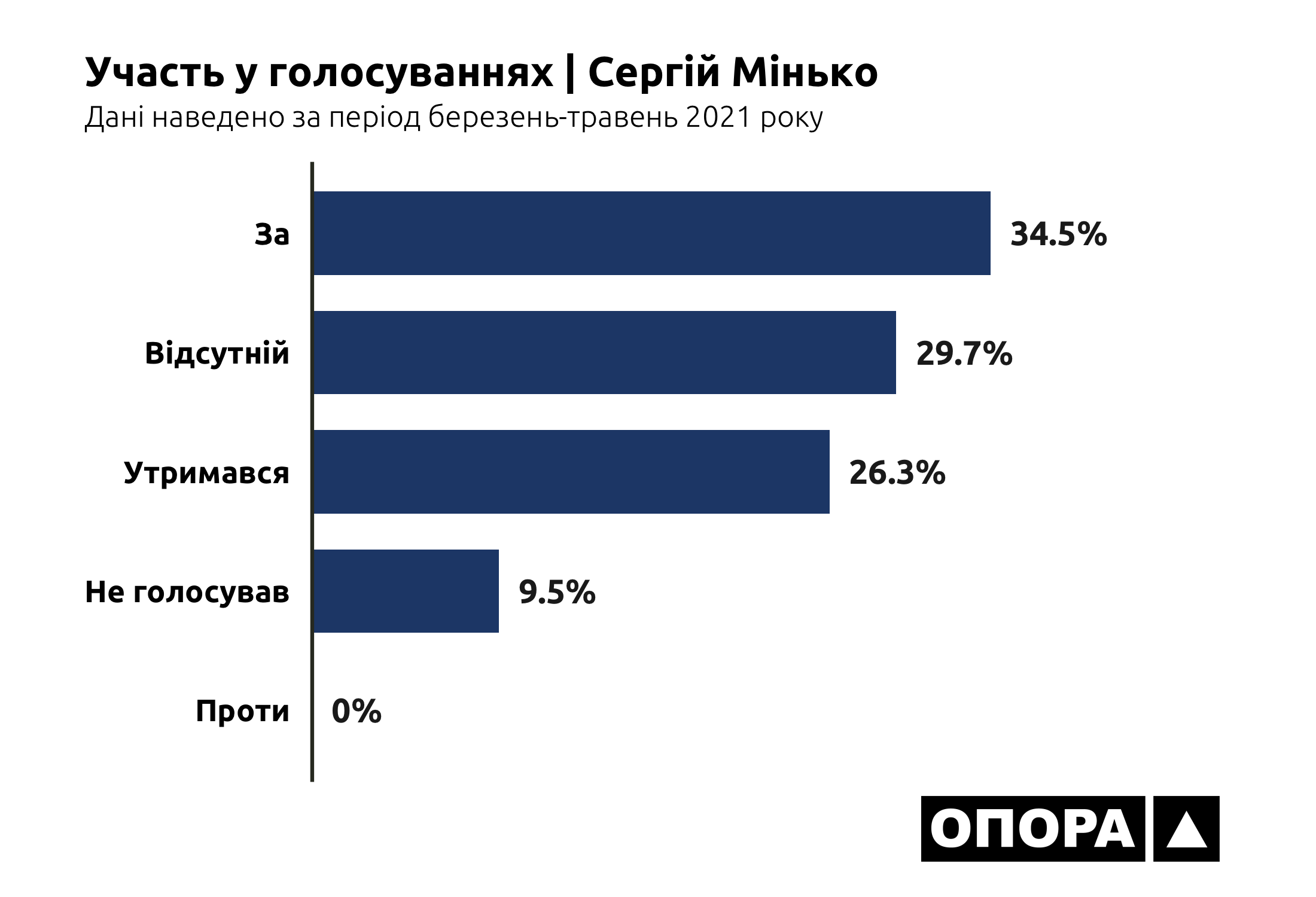 З часу набуття депутатських повноважень Сергій Мінько голосував проти загального рішення фракції 1 961 раз (33% випадків) при показнику присутності на 72% голосувань.