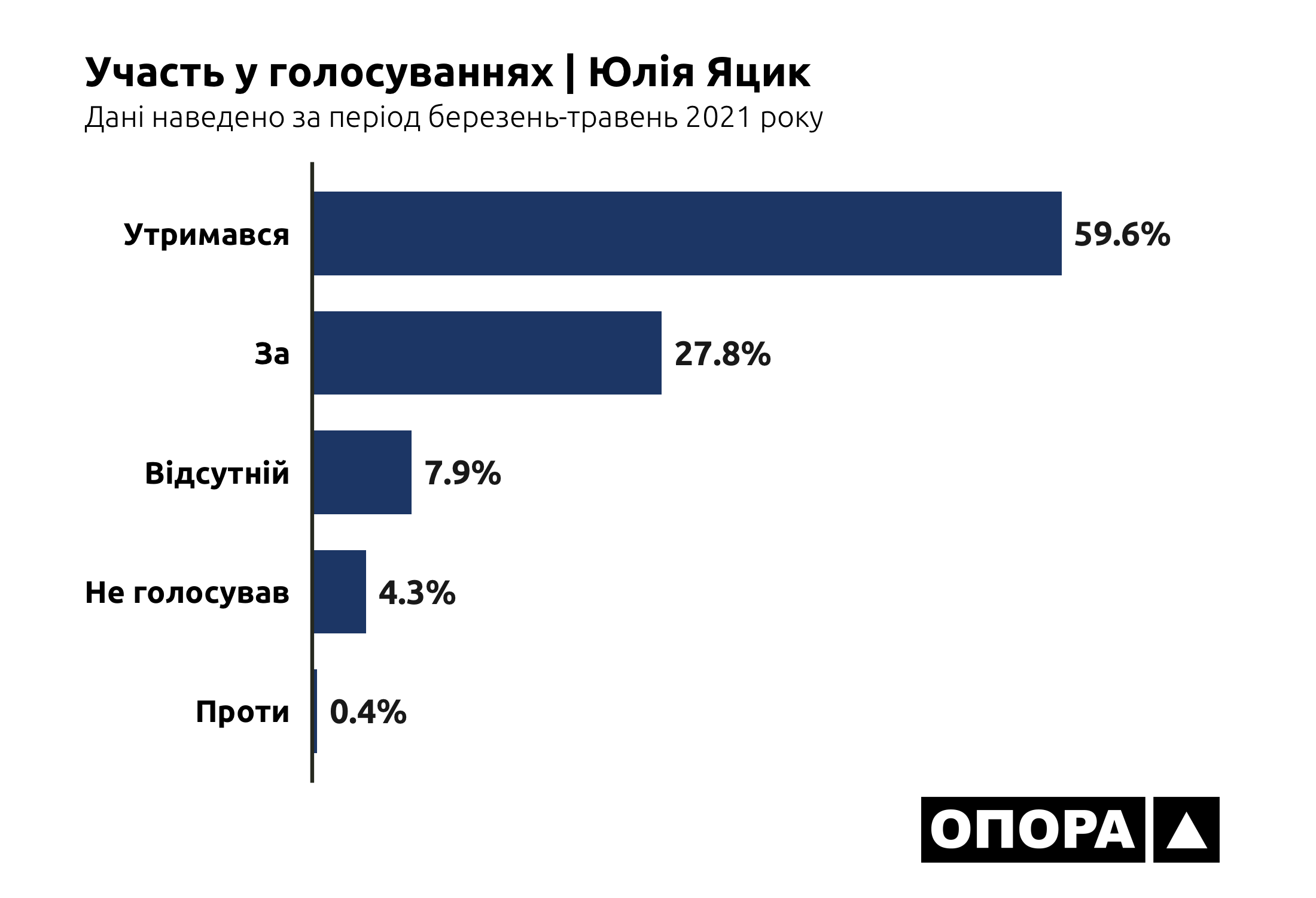 Юлія Яцик була присутня у 94% випадках голосувань. Процедурно не схвалювала рішення своєї фракції у 17% випадках (1 323 рази).