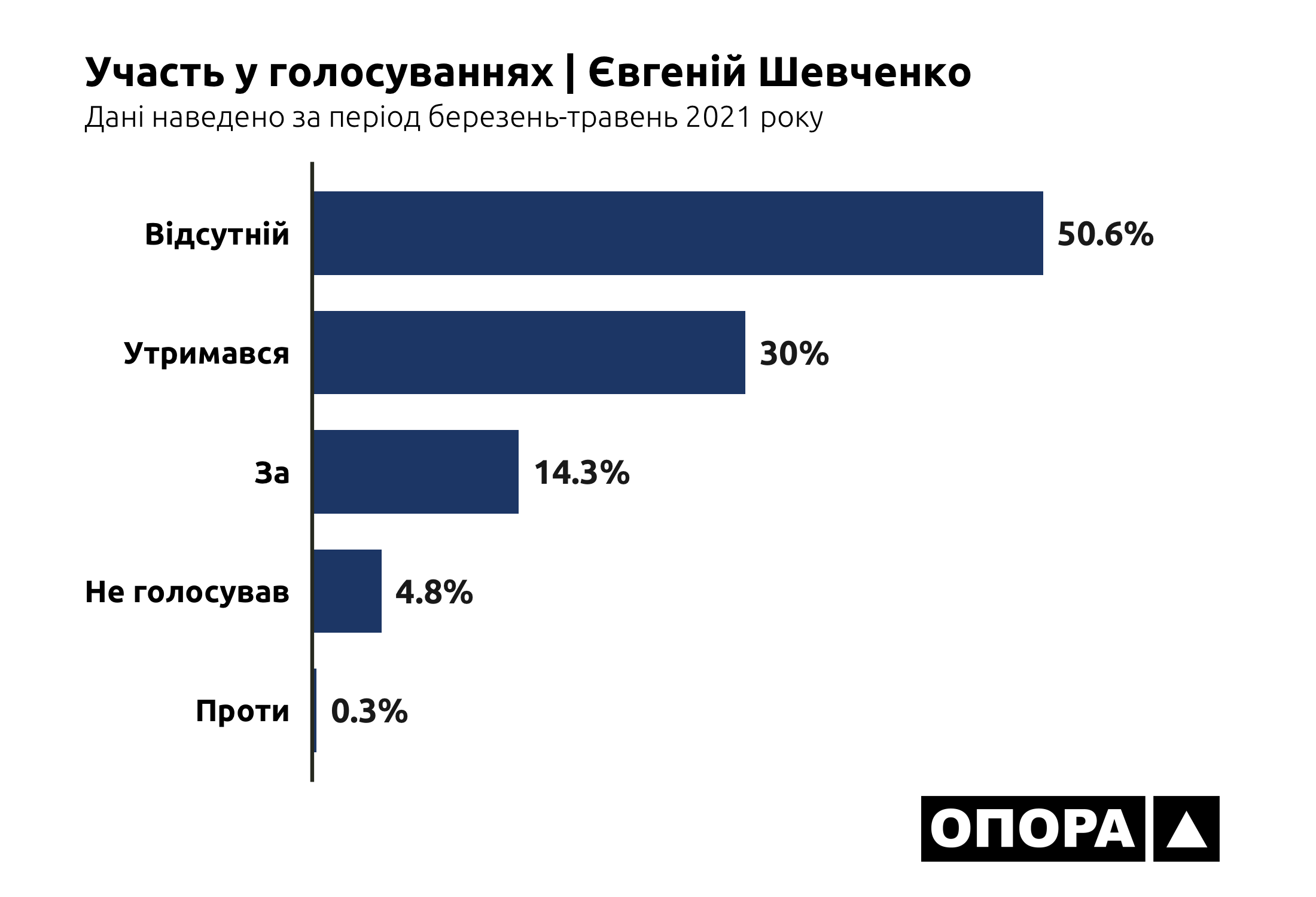 При показнику 96% присутності під час голосувань після набуття повноважень – у 8,5% випадках голосував проти рішення своєї фракції (675 разів).