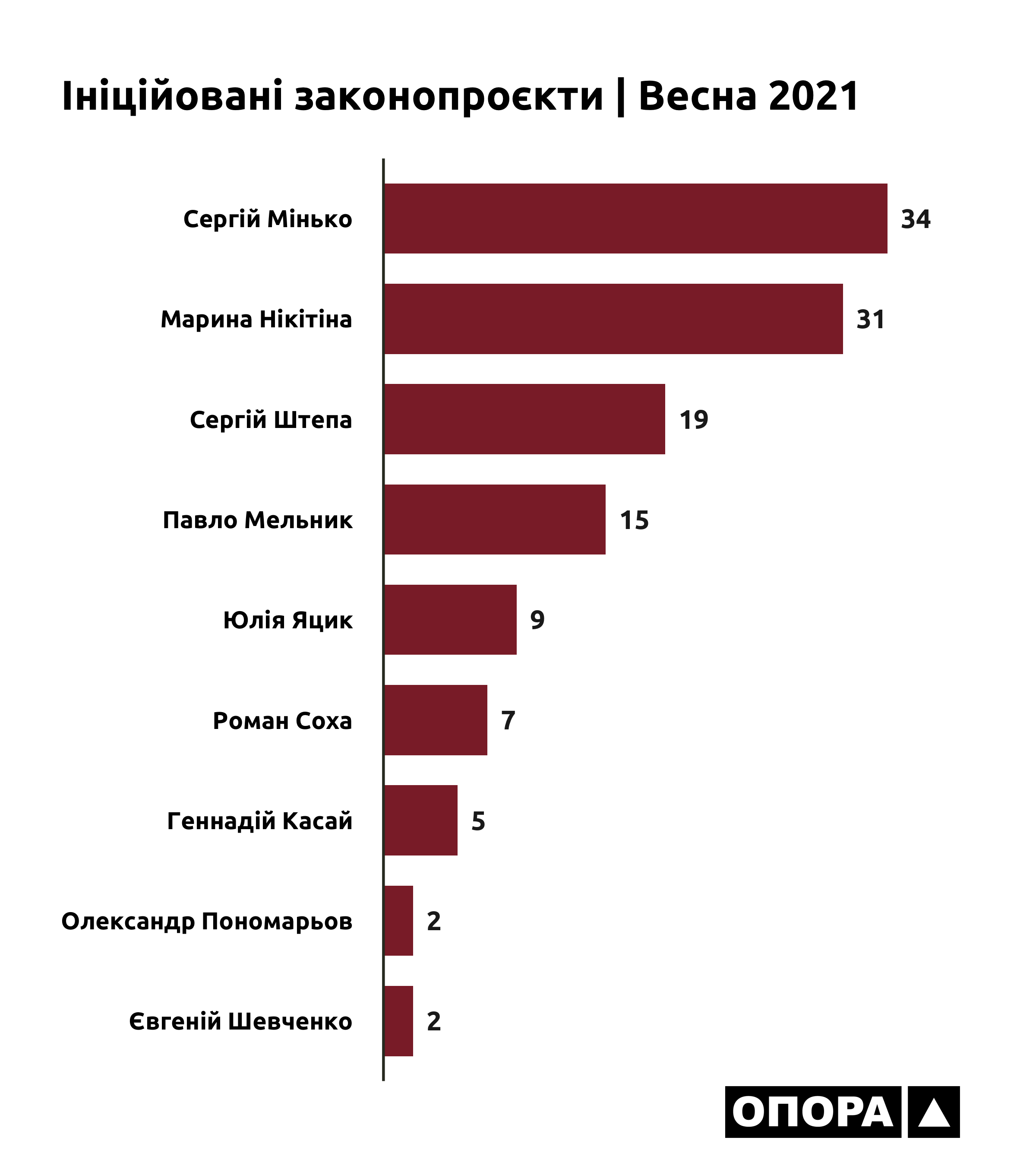 Окрім Сергія Мінька по одному позитивному досвіду прийнятого розробленого ними законопроєкту мають Євгеній Шевченко, Геннадій Каса та спільно Павло Мельник і Сергій Штепа. При цьому впродовж весни жодним депутатом мажоритарником від Запорізької області не запропонований проєкт розробленим ним одноосібно – всі ініціативи створені у співавторстві.
