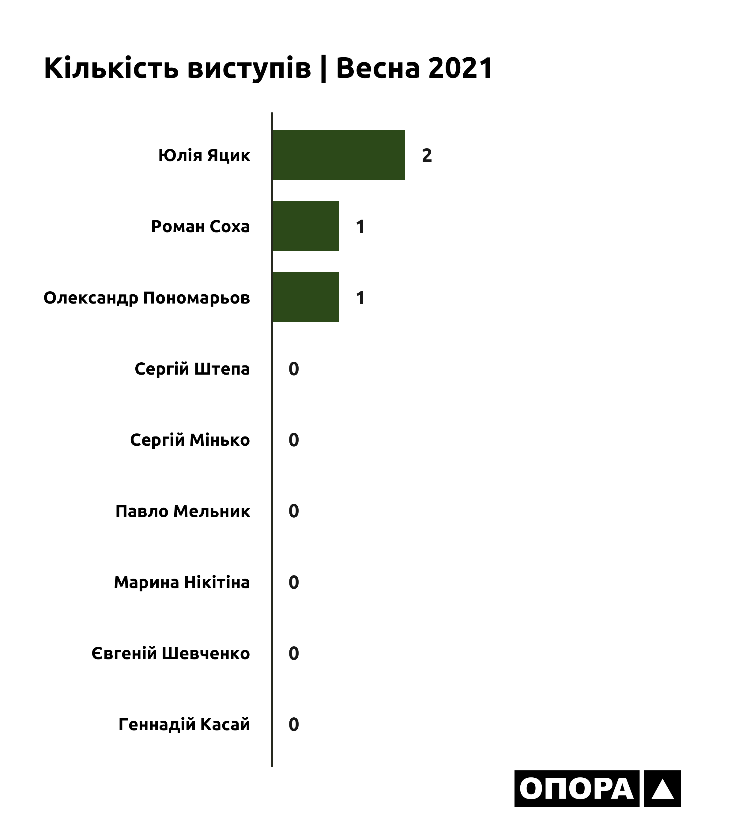 З березня по травень можливістю виступити з трибуни скористалося троє депутатів. Двічі Юлія Яцик та по одному разу Роман Соха і Олександр Пономарьов. На своїх сторінках у соціальних мережах окремо висвітлив це лише Роман Соха.