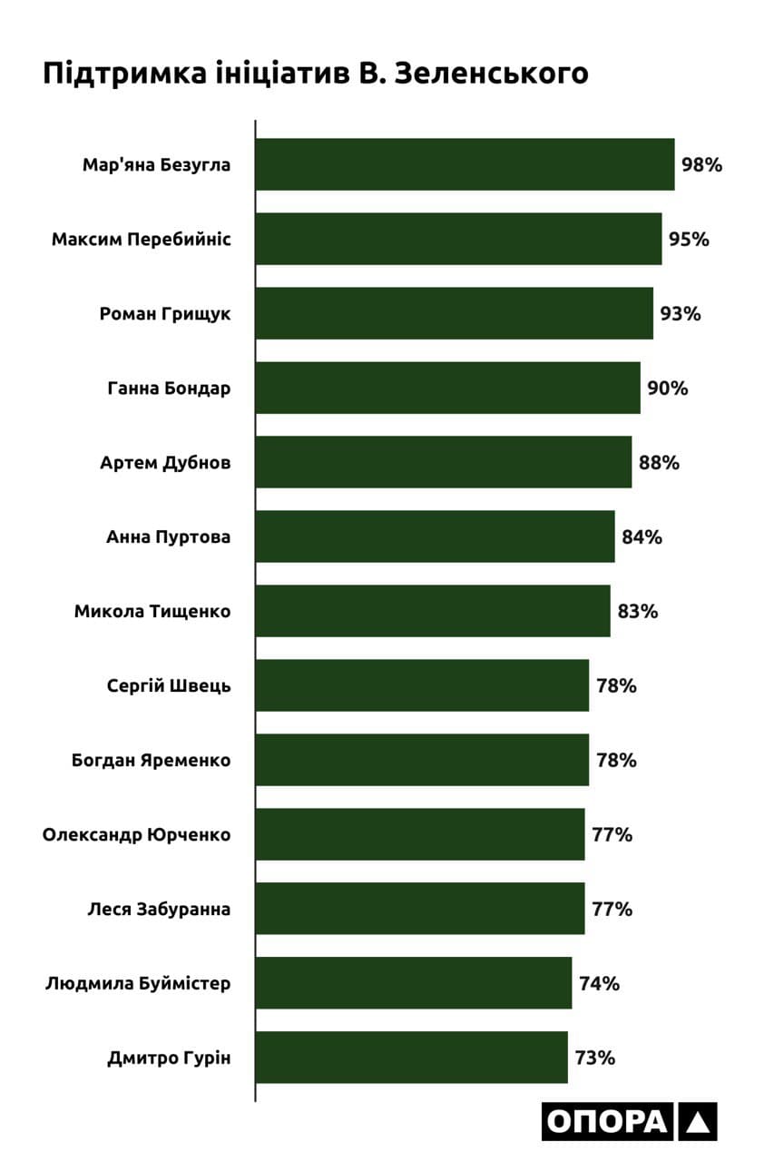 Показник підтримки Володимира Зеленського народними депутатами Києва за такий самий часовий період є вищим ніж в його попередника. Так 13 депутатів підтримують ініціативи Президента більш як на 70%, що певно можна вважати абсолютним рекордом у розрізі всіх парламентських скликань. Поза тим, є депутат, який голосував проти однієї з ініціатив президента, яка стосувалася запобігання корупції. Мова йде про обранця від ОВО №219 – Миколу Тищенка. Проте не дивлячись на такий вияв протесту з боку одного з мажоритарників, проєкт закону було підтримано більшістю депутатів та невдовзі підписано.