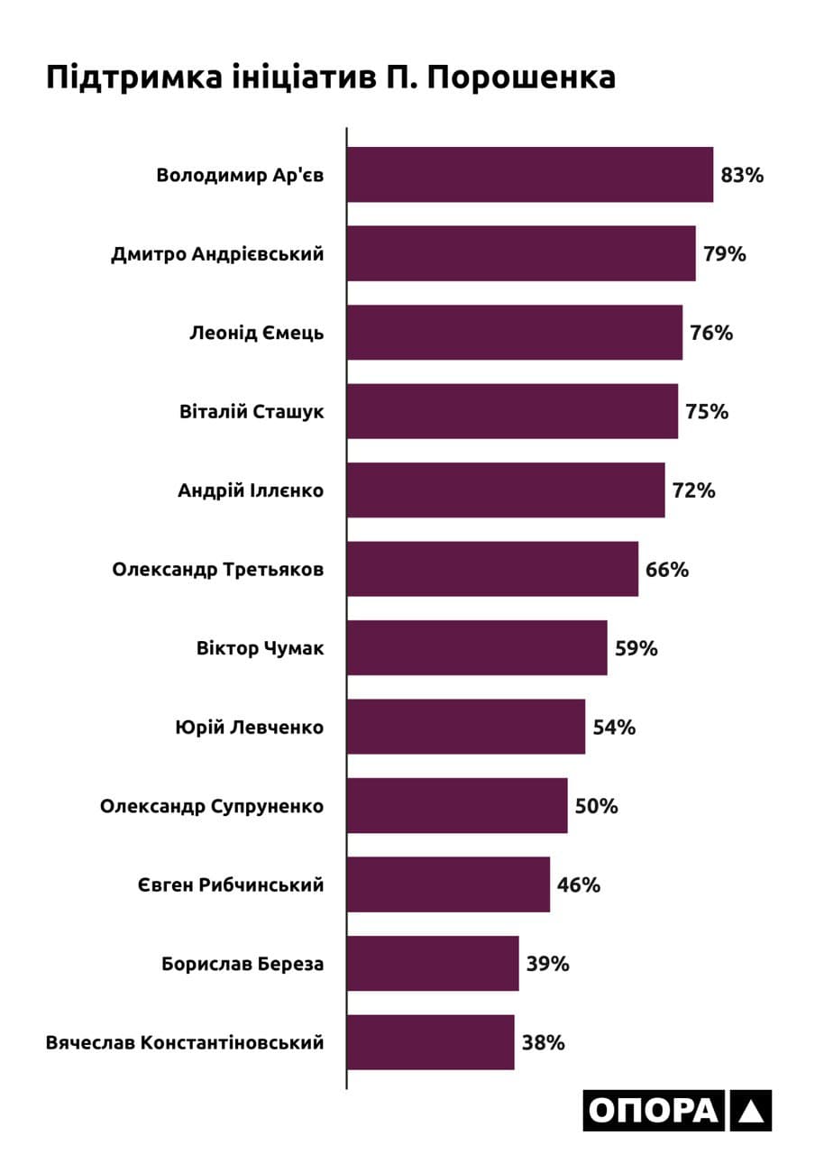 Відповідно до наведених вище даних можна зробити висновок щодо електоральної прихильності громадян України до політичних партій. Проте дослідивши підтримку законодавчих ініціатив президента народними депутатами, можна прослідкувати чи дійсно обрані депутати мажоритарники підтримують бачення розвитку країни очільника держави.