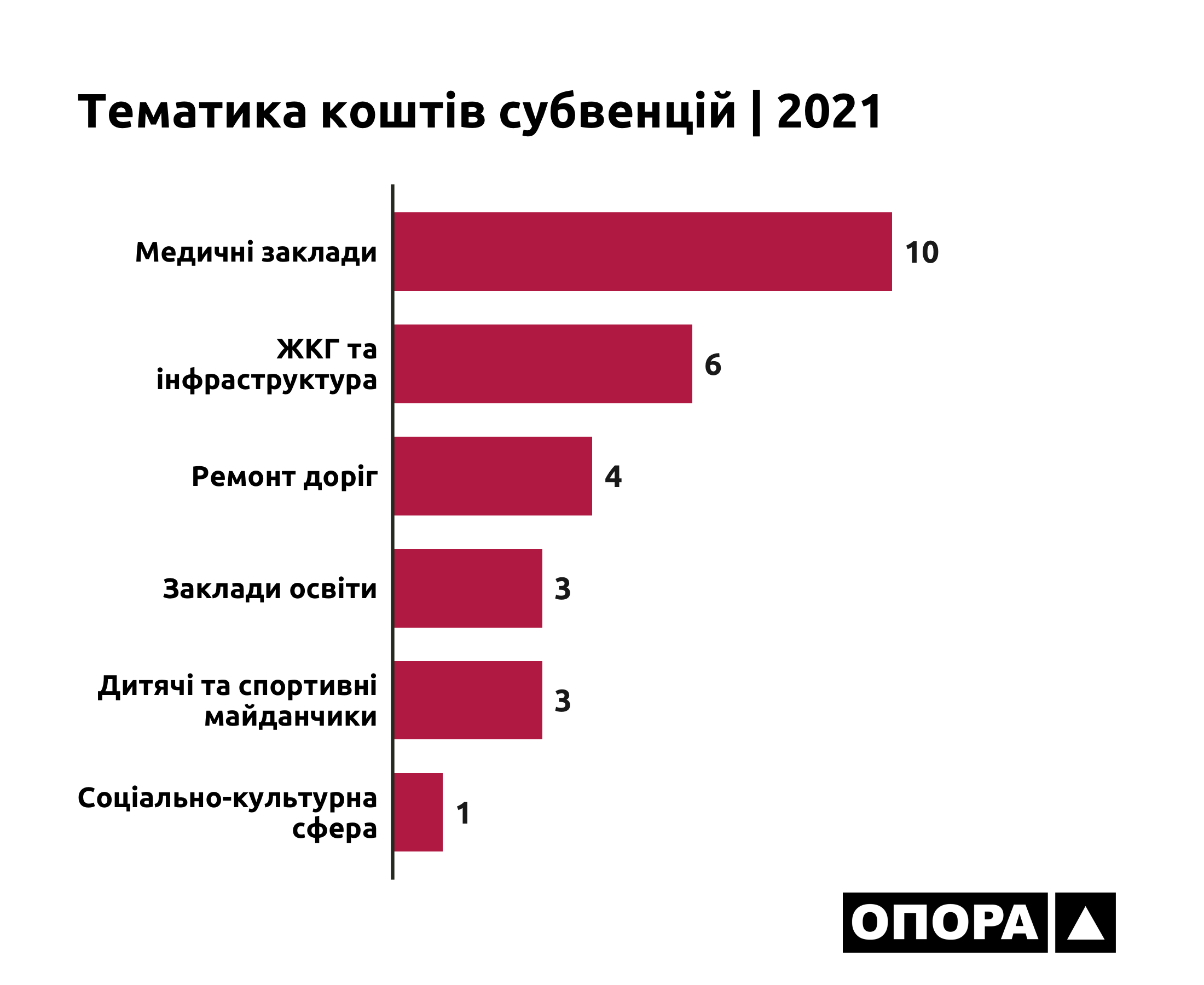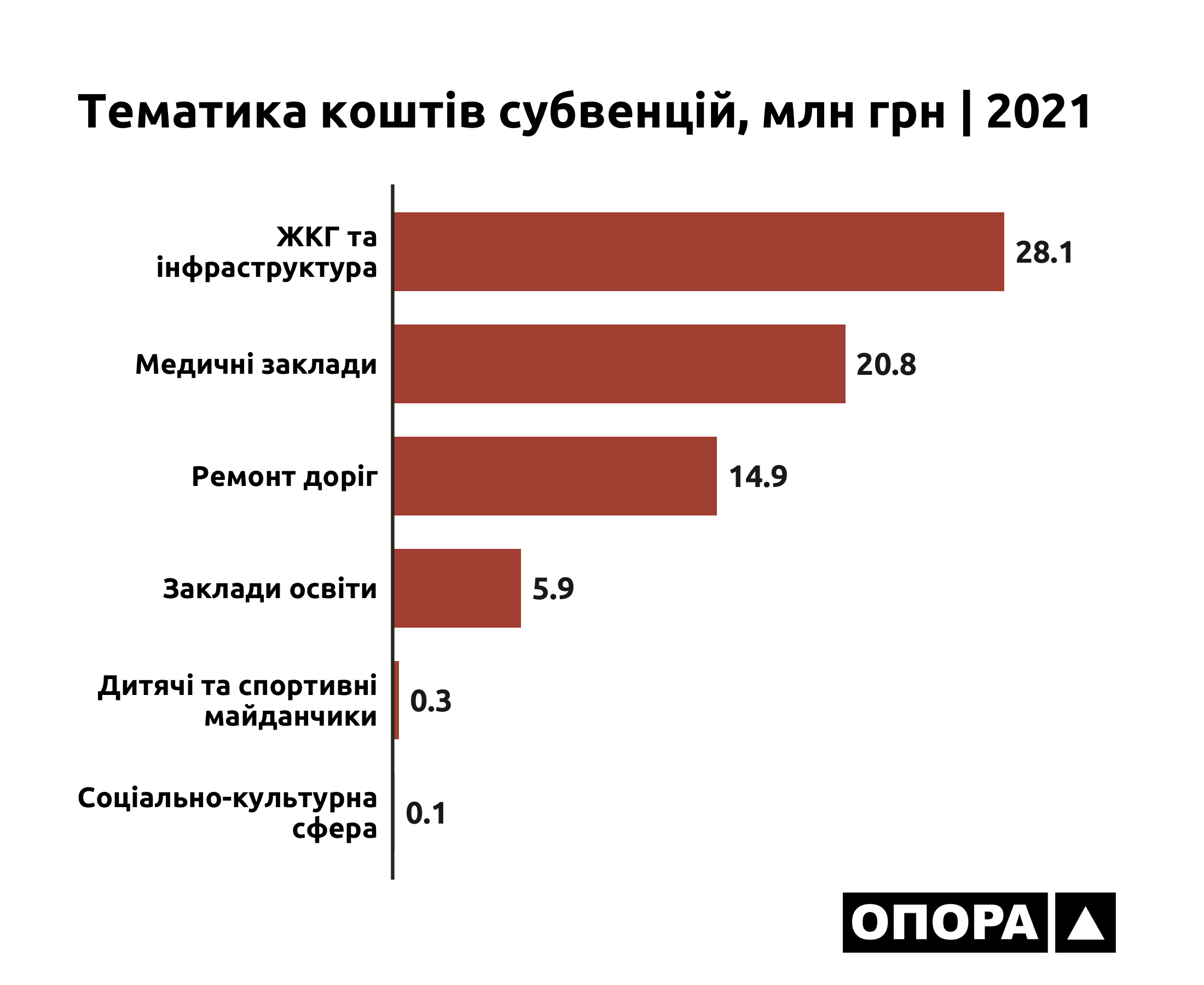 Натомість, у розрізі суми, найбільше коштів пішло на сфери ЖКГ та розвитку інфраструктури. Друге місце у «топі» у медичних закладів, а третє має ремонт доріг.