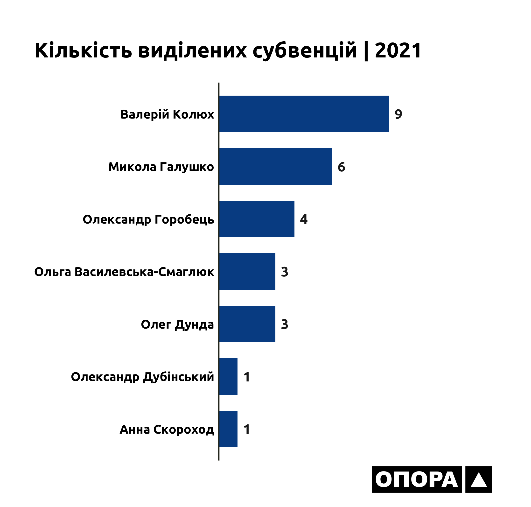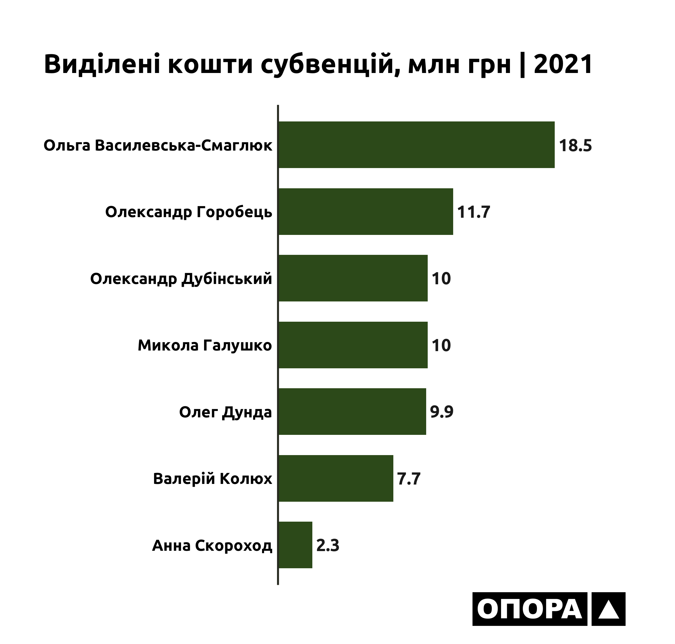 Зважаючи на те, що народні обранці беруть активну участь у формуванні та виділенні державних субвенцій, ОПОРА проаналізувала і цей аспект. Зазначимо, що більшість нардепів, які отримали кошти для розвитку громад у своїх округах – це представники монобільшості, фракції «Слуга народу». Серед них – Ольга Василевська-Смаглюк, Олександр Горобець, Микола Галушко, Олег Дунда та Валерій Колюх. Ба більше, ще два обранці, які отримували субвенції для своїх округів – в минулому представники тої ж таки «Слуги народу». Йдеться про нині позафракційного депутата Олександра Дубінського та представницю «За майбутнє» – Анну Скороход. Вони, до речі, отримали по одній субвенції.