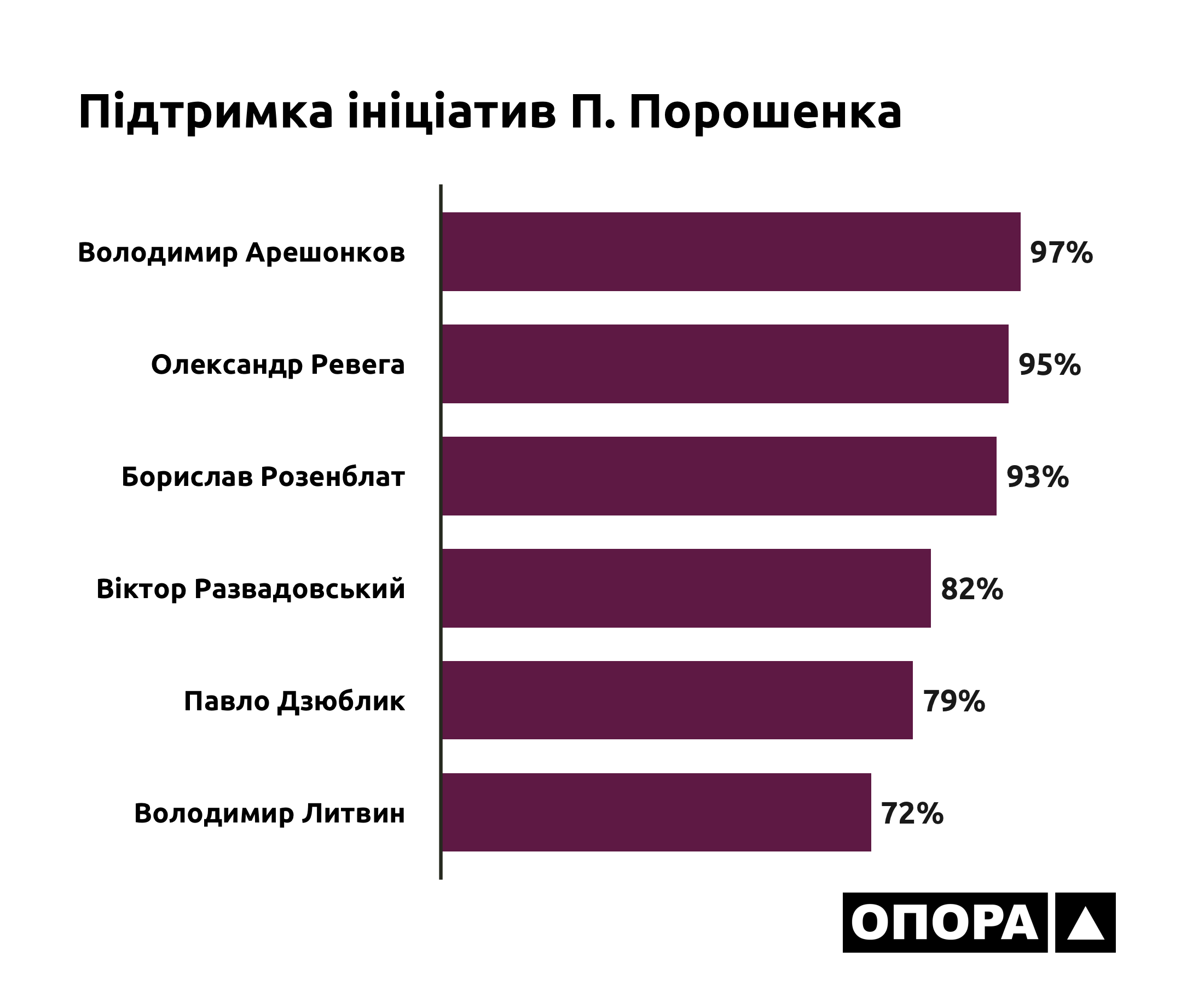 Трохи меншу підтримку, але однак високу, демонстрували самовисуванець Олександр Ревега (63 ВО, м. Бердичів), який у парламенті увійшов до фракції «Блоку Петра Порошенка «Солідарність» – 95% при присутності на сесіях у 90%, та Борислав Розенблат (62 ВО, м. Житомир) з підтримкою в 93% та присутністю на 86% засідань. Варто зазначити, що пан Розенблат перебував у складі фракції «Блоку Петра Порошенка «Солідарність» з листопада 2014 року по липень 2017 року. В подальшому був позафракційним депутатом.
