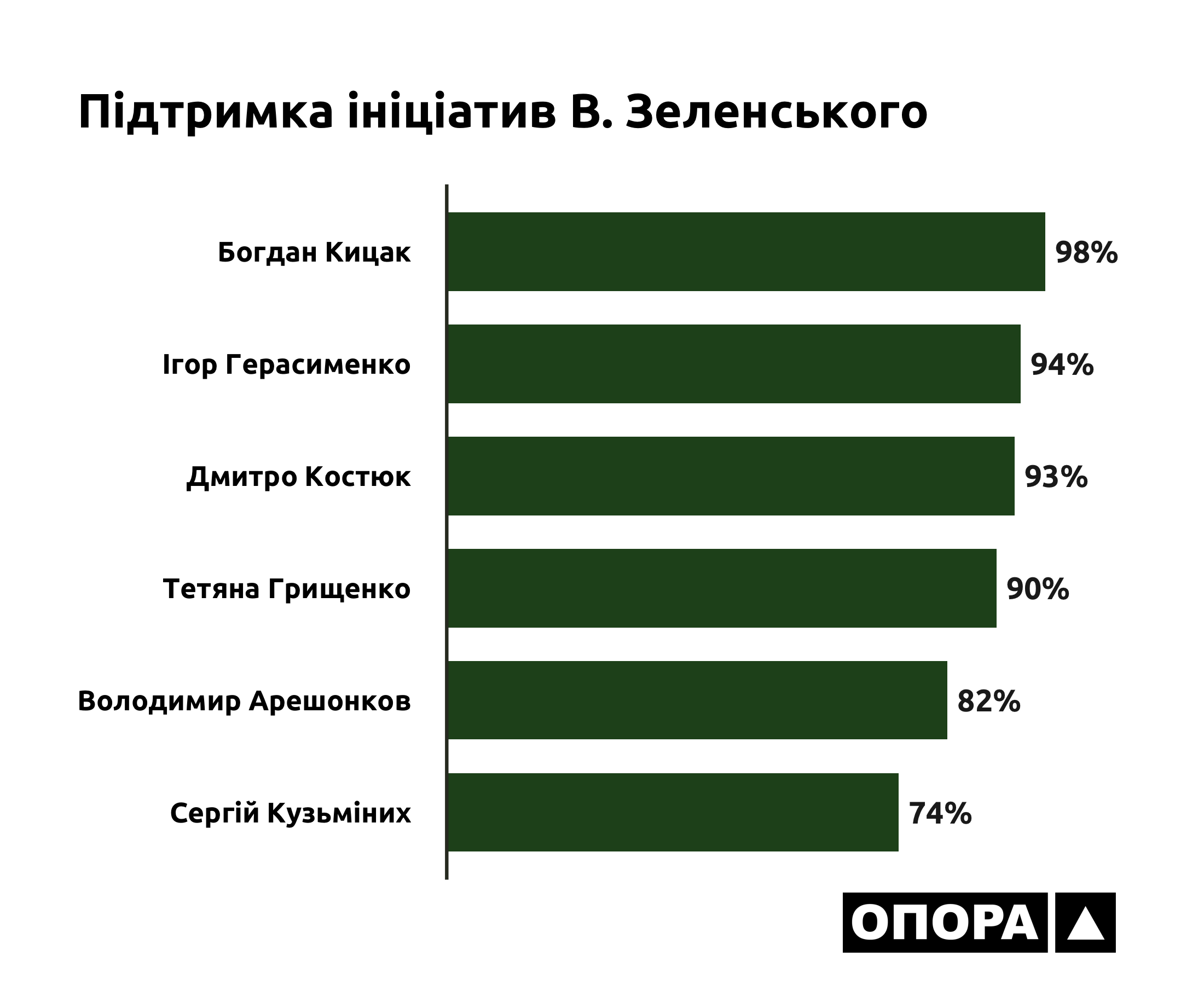 Серед депутатів області найвищу підтримку Президента демонстрував висуванець по 63 ВО (м. Бердичів) Богдан Кицак – 98% підтримки при 99% присутності на голосуваннях. Трохи меншу – 94% та 93% відповідно показували Ігор Герасименко, висуванець 62 ВО (м. Житомир) та Дмитро Костюк, висуванець по 65 ВО (м. Новоград-Волинський).