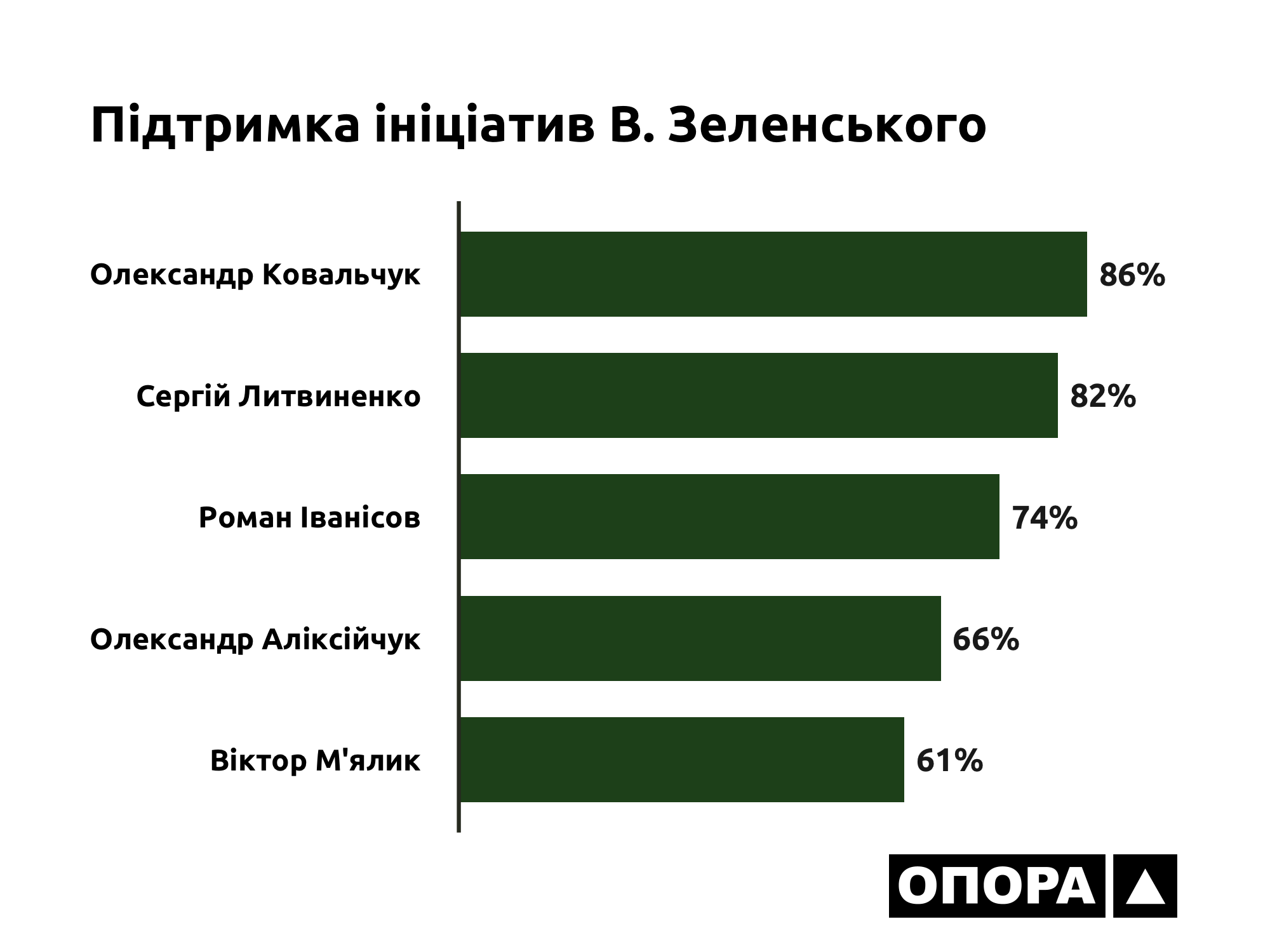Володимир Зеленський за 2 перші роки свого перебування на посаді Президента України зареєстрував більшу кількість законопроєктів (134), ніж його попередник Петро Порошенко (82). Народні депутати IX скликання дещо краще голосують за президентські ініціативи (68%), ніж їхні колеги з VIII скликання (60%). Проте рівень підтримки ініціатив двох президентів є високим (більше 60%). Рівненські народні обранці загалом підтримують законодавчі ініціативи двох президентів. У поточному скликанні найбільше президентські ініціативи підтримує Дмитро Соломчук (“Слуга народу”), найменше – Яна Зінкевич (“Європейська Солідарність”). У VIII скликанні найбільший рівень підтримки ініціативам Президента демонстрував Олександр Дехтярчук (БПП “Солідарність”), найменше – Андрій Лозовий (Радикальна партія).