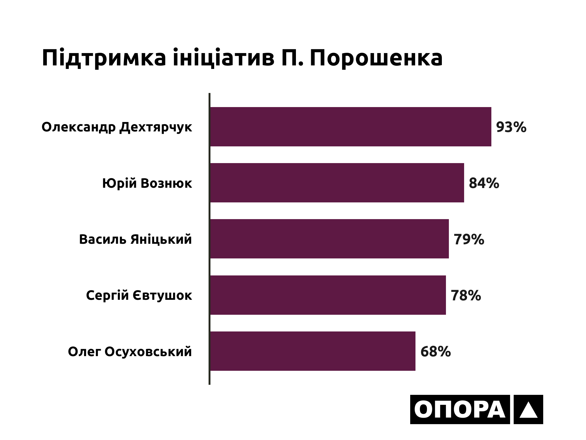 Найбільше законопроєкти Президента підтримувала фракція “Народний фронт”. Так, у 78,5% випадків депутати цієї політичної сили голосували “за” та у 0,1% випадку – “проти”. Дещо менше підтримувала ініціативи Президента його фракція у парламенті. Депутати Блоку Петра Порошенка “Солідарність” у 74,4% випадків голосували “за” і у 0,1% – проти. ВО “Батьківщина” підтримувала президентські законопроєкти у 65,5% випадків. Радикальна партія Олега Ляшка підтримувала ініціативи Президента у 57,2% випадків та у 3,3% випадків голосувала “проти”. Найменше підтримували позафракційні депутати, лише у 48,3% випадків. Також варто зазначити, що у розрізі регіонів депутати з Рівненщини у 80,6% випадків голосували “за” ініціативи, які реєстрував в парламенті Петро Порошенко.