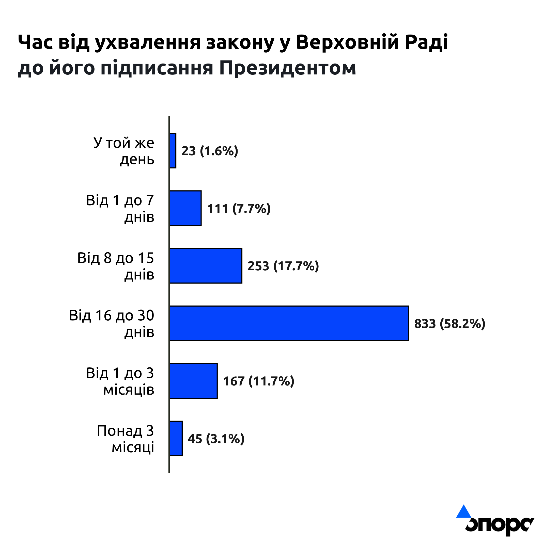 Загалом у парламенті ІХ скликання було ухвалено (а згодом — підписано Президентом) понад 1430 законопроєктів. І хоча глава держави має 15 днів після отримання закону, щоб підписати його або повернути зі своїми вмотивованими пропозиціями до Верховної Ради для повторного розгляду, насправді цю норму на практиці виконують далеко не завжди. Так, середній час підпису закону Президентом становить близько 26 днів, а медіанний — 20 днів.