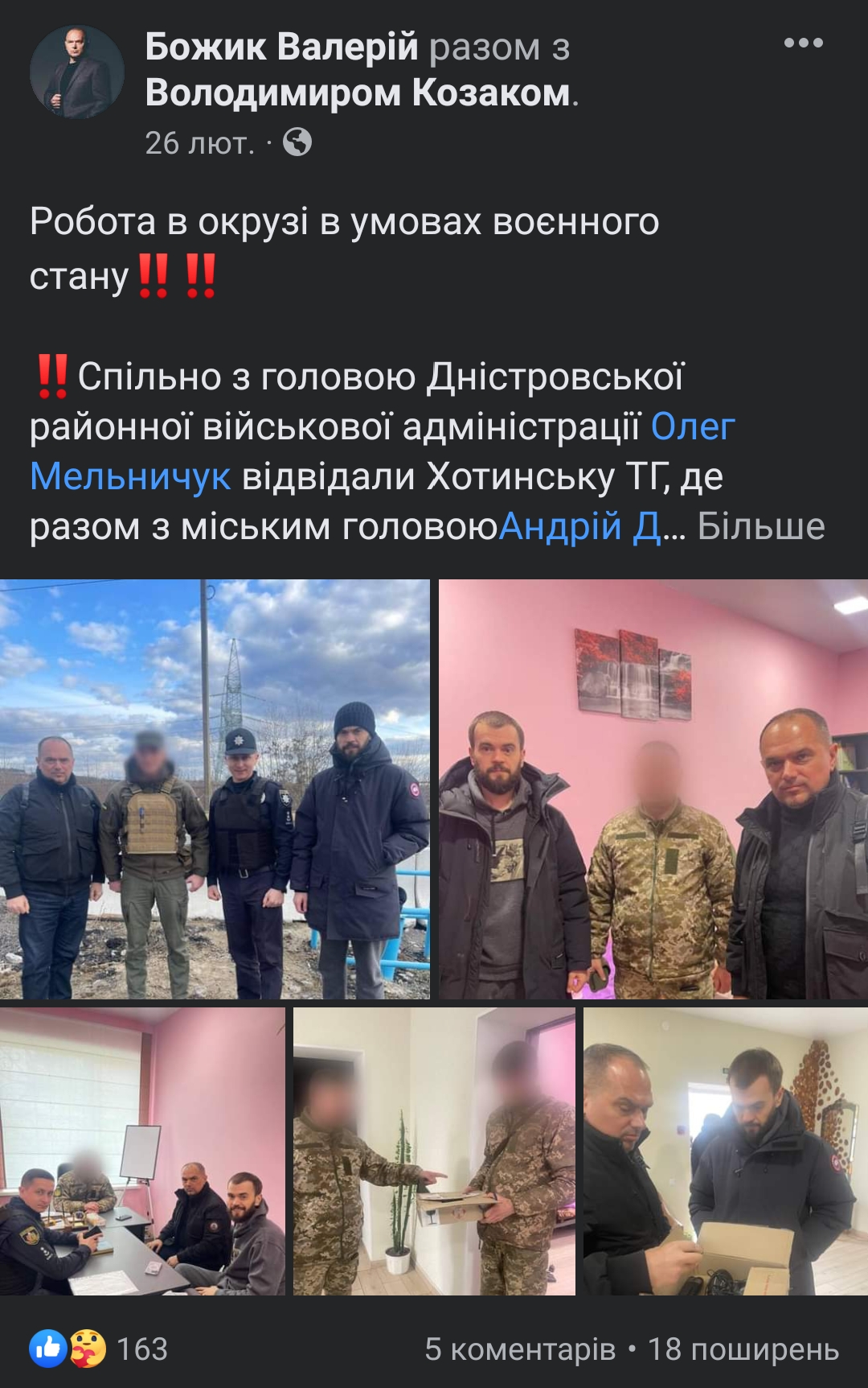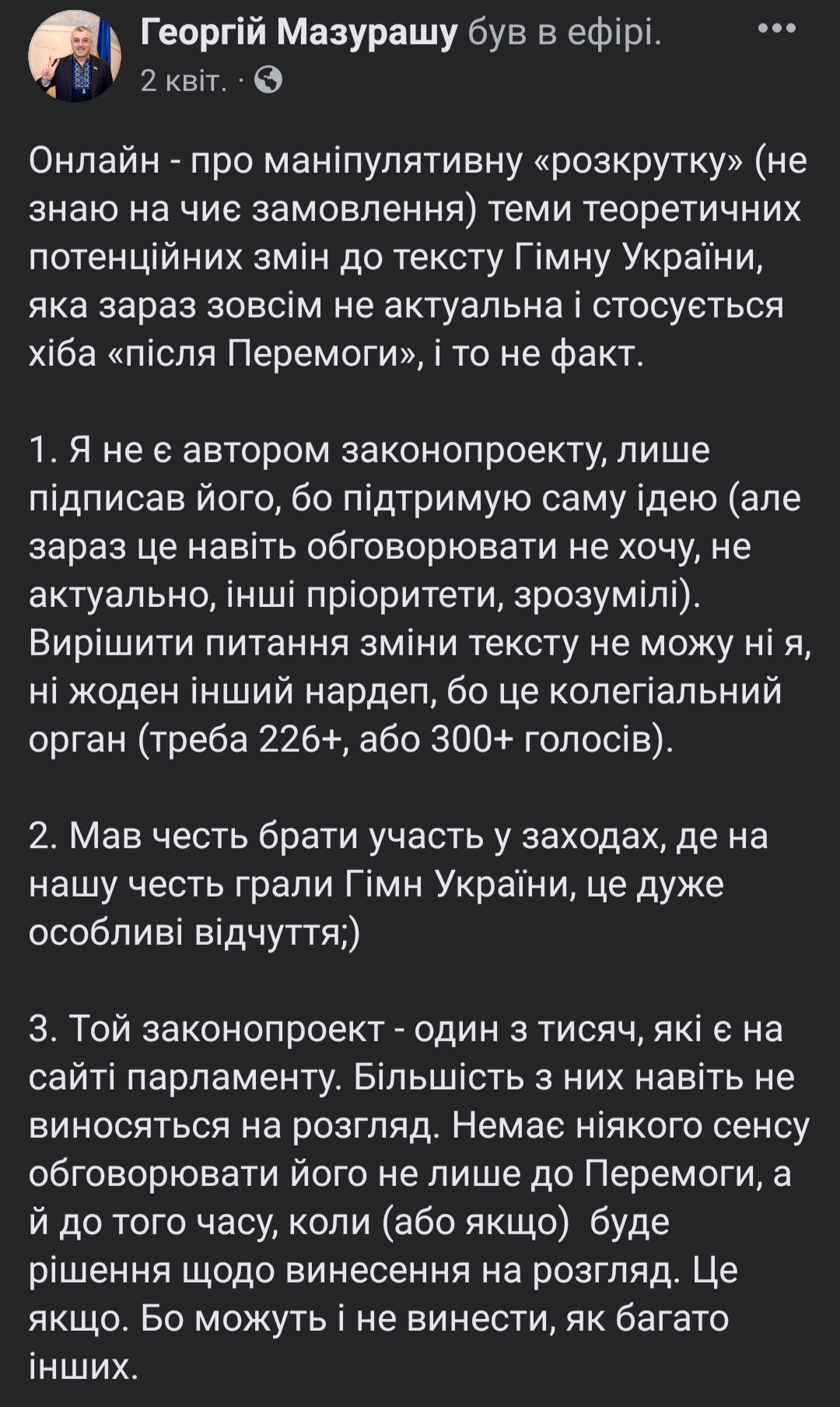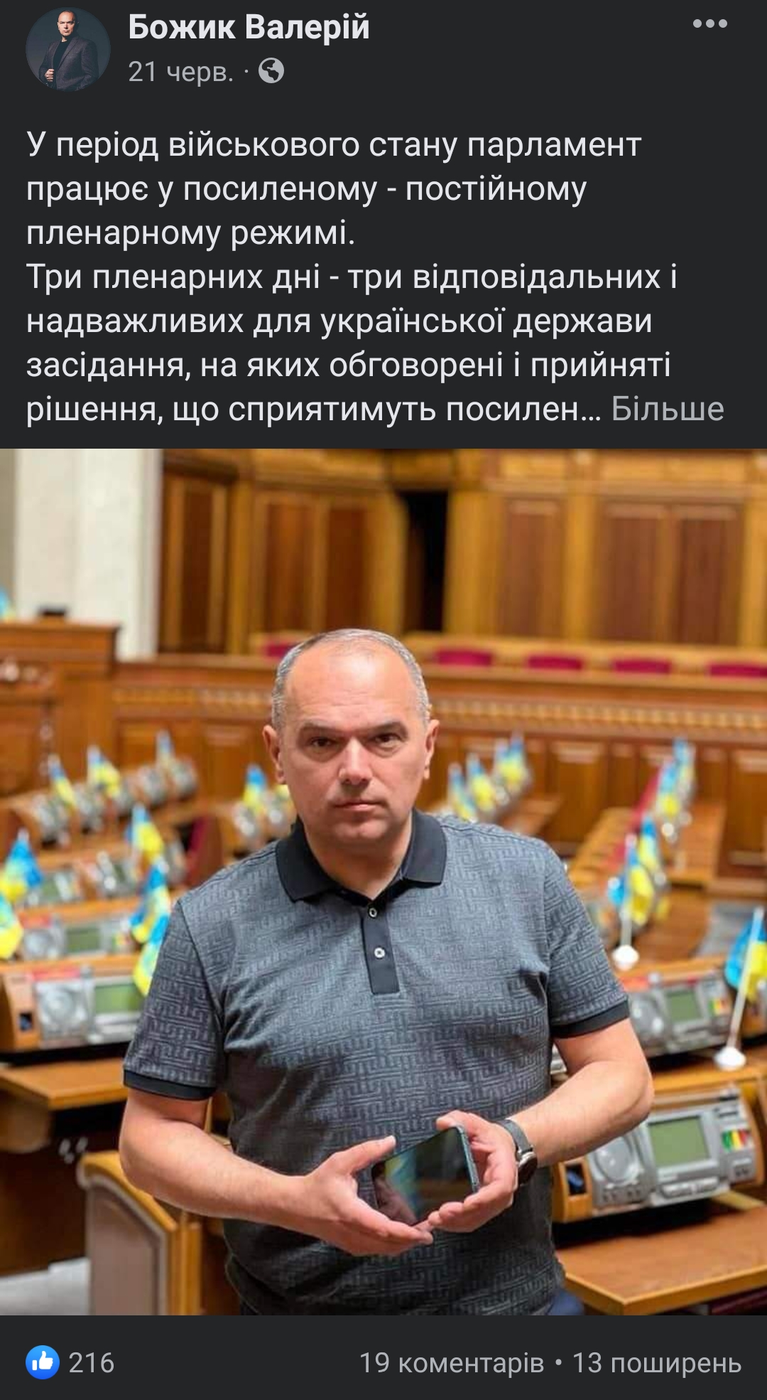 Депутат писав про свою участь в засіданнях Комітету ВРУ з питань молоді і спорту, а також про розгляд його законодавчої ініціативи Комітетом ВРУ з питань прав людини, деокупації окупованих територій, нацменшин і міжнародних відносин. Йдеться про законопроєкт №7381 щодо оптимізації дій в умовах воєнного часу для зміцнення економіки та обороноздатності держави.