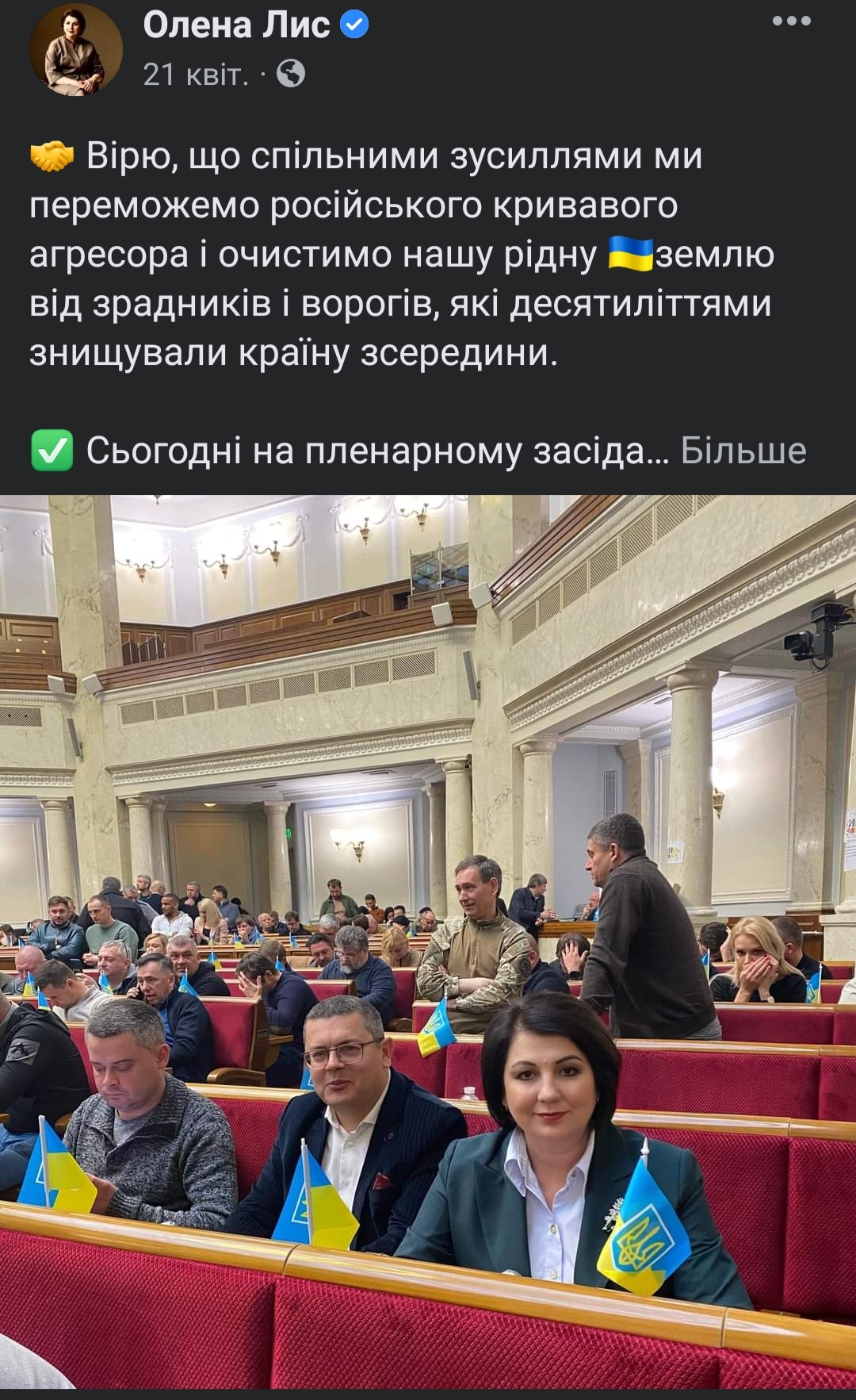 8 березня, у Міжнародний день жінок, Олена Лис зробила публікацію, де не акцентувала увагу безпосередньо на жінках. В дописі була лише одна фраза: «Миру! Все буде-Україна!». 24 квітня депутатка привітала своїх підписників із Воскресінням Христовим двома дописами, в одному з яких було відео Володимира Зеленського. Також публікація, пов’язана з цим християнським святом, з’явилася на її сторінці 26 квітня. У День пам’яті та примирення, 8 травня, Олена Лис зробила допис зі словами «НІКОЛИ ЗНОВУ» та зверненням Володимира Зеленського у зв’язку з подіями Другої світової війни. Наступного дня, у День матері, депутатка написала про роль материнства. 15 травня народна обраниця поширила допис Президента України з привітанням гурту «KALUSH» із перемогою в конкурсі «Євробачення». 20 травня Олена Лис не забула згадати про третю річницю інавгурації Володимира Зеленського. Також депутатка висловила співчуття з приводу смерті першого президента України Леоніда Кравчука. 1 червня Олена Лис привітала малюків та підлітків із Міжнародним днем захисту дітей, згадавши про тих, хто постраждав під час війни. Також цим днем датується допис народної обраниці про весілля переселенців із Херсонщини у прихистку «Шелтер» (наречений — військовослужбовець ЗСУ). 17 червня депутатка зробила репост публікації Олени Шуляк щодо рекомендації Єврокомісії надати Україні статус кандидата на членство в ЄС, а вже за кілька днів — про остаточне рішення.