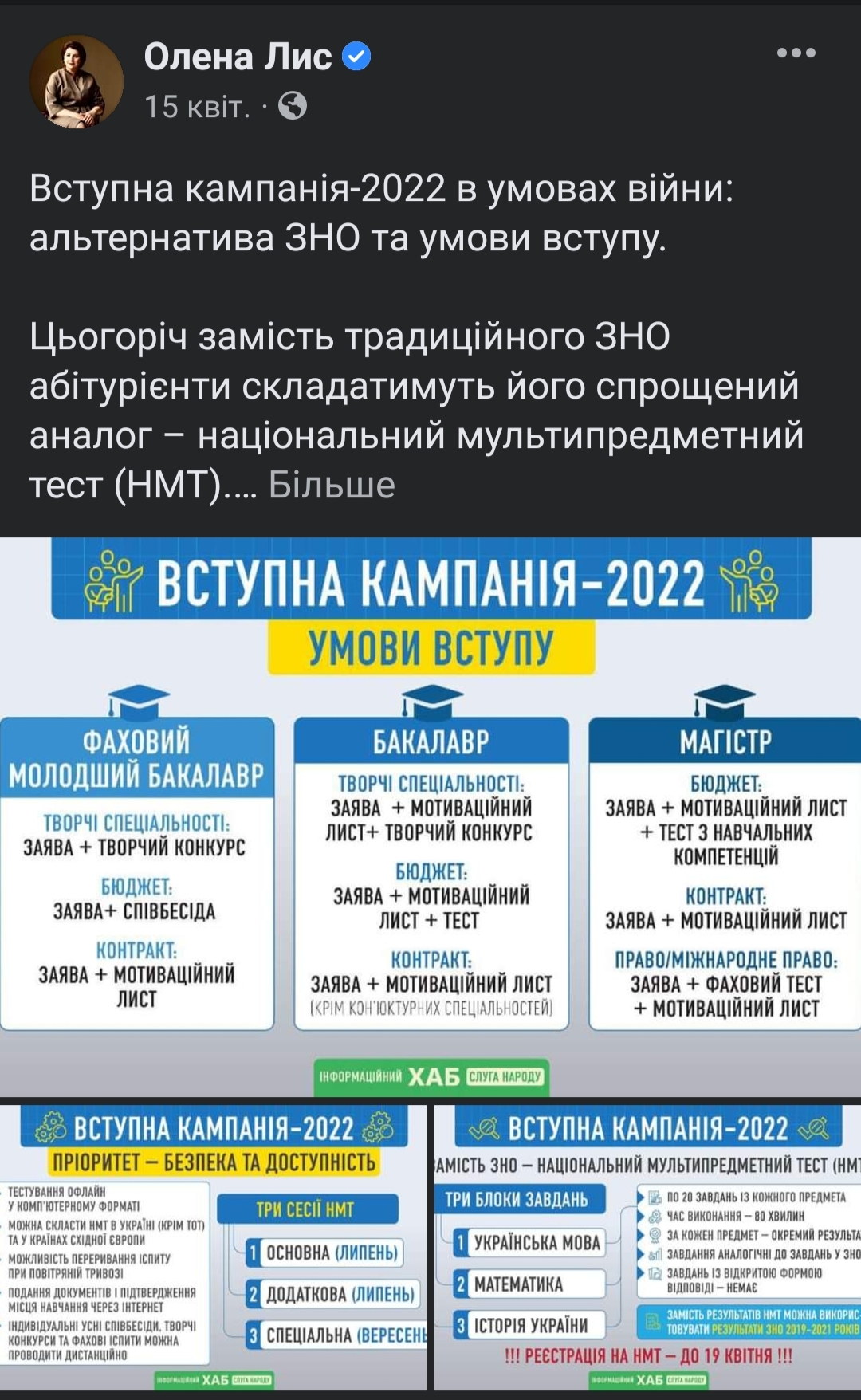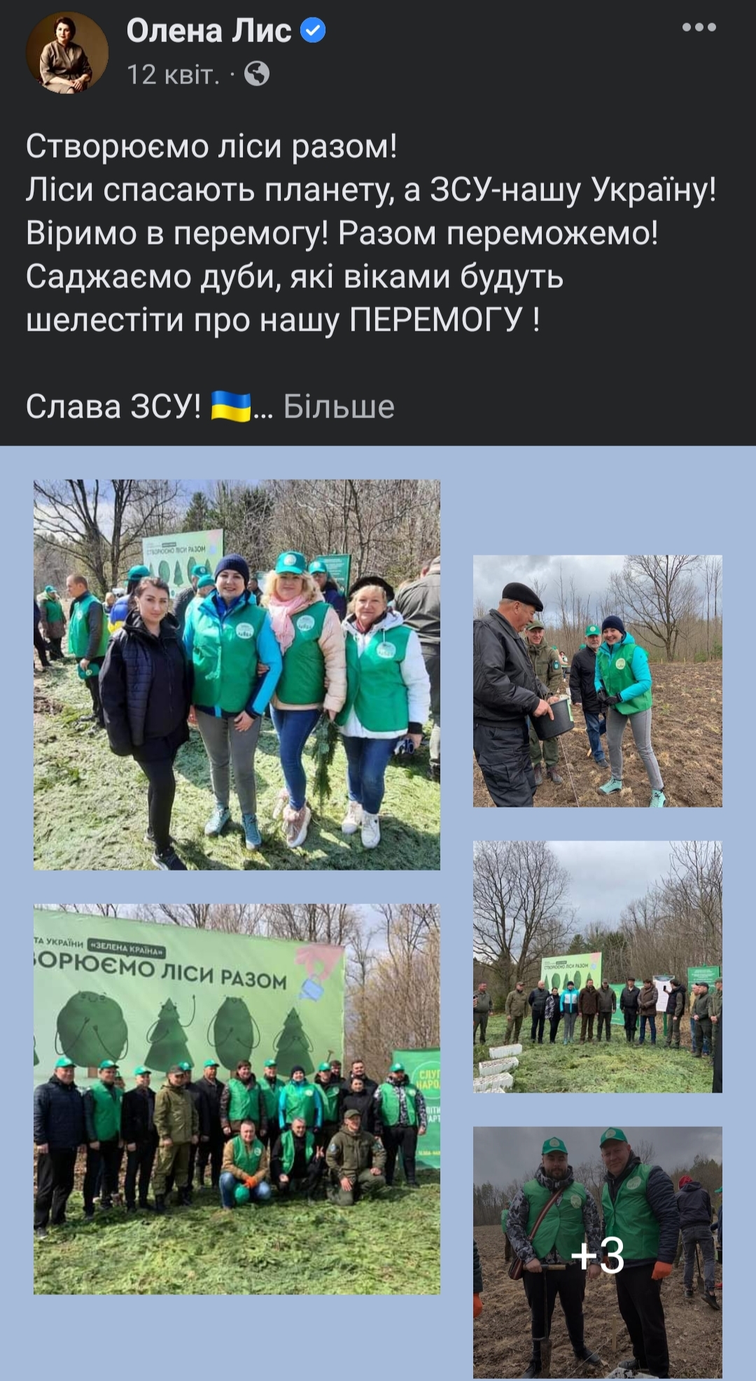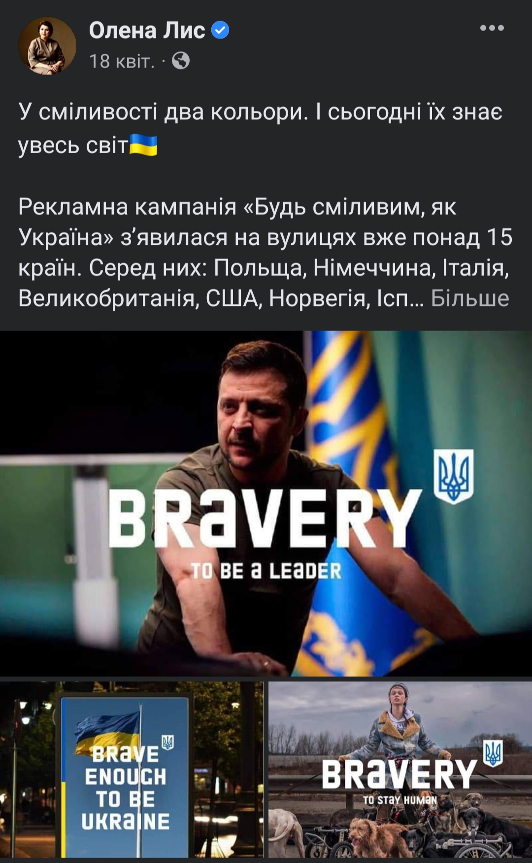 18 квітня депутатка розповіла своїм підписникам про запуск рекламної кампанії «Будь сміливим, як Україна» у містах західних країн. 6 травня Олена Лис зробила допис про ініціювання президентом глобальної ініціативи United24, котра повинна об’єднати людей з усього світу для допомоги Україні. 3 червня депутатка опублікувала інформацію про те, як змінилася країна за 100 днів війни.