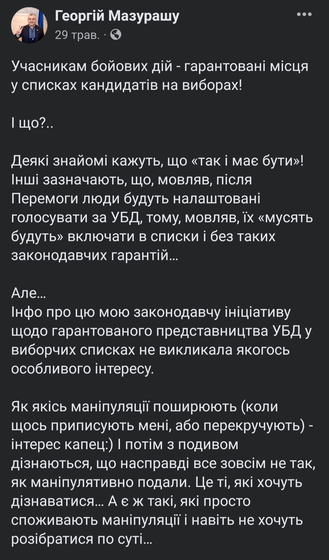 Також Георгій Мазурашу репостив дописи з групи «Lenta.ru» про нібито смерть владіміра путіна. Недостовірна інформація на його сторінці стосувалась і Стамбульської конвенції — буцімто отримання Україною статусу кандидата в члени ЄС залежало від ратифікації цього документа. Окремо варто звернути увагу і на те, що депутат поширює відео Юрія Швеця — колишнього майора закордонної розвідки КДБ.