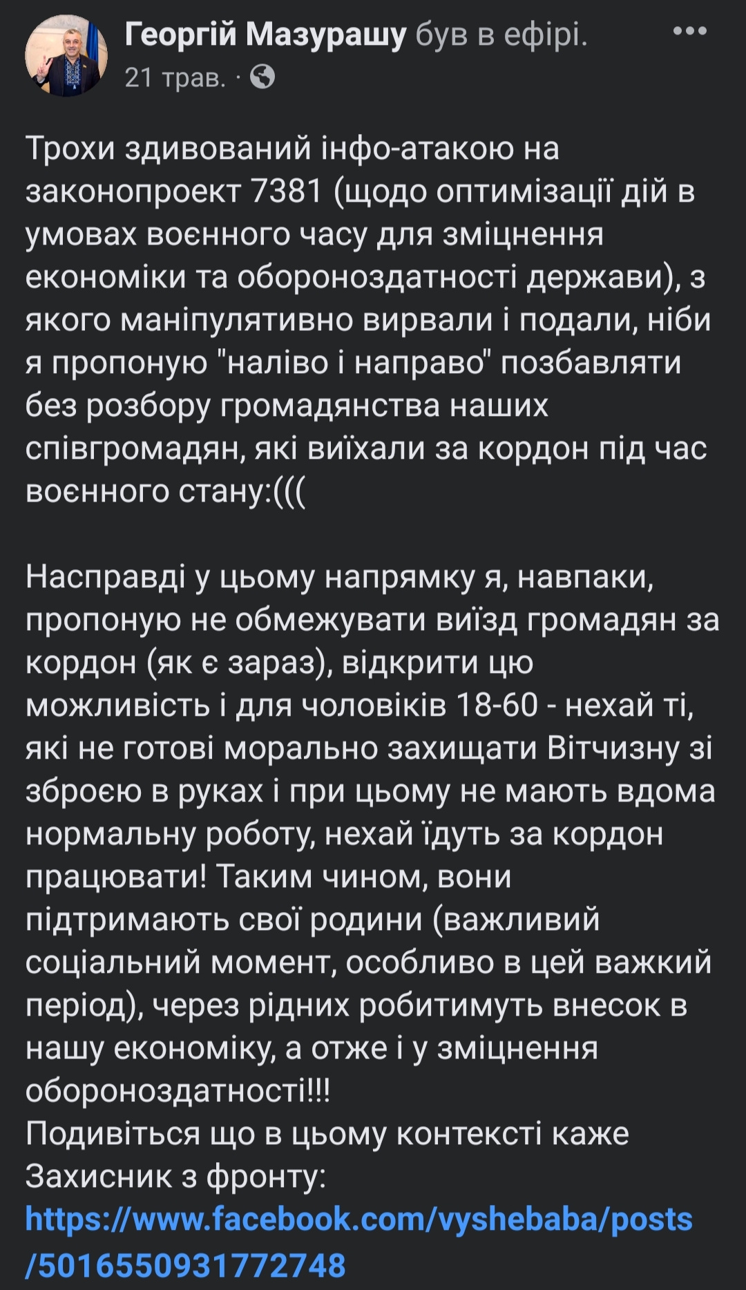 - Законопроєкт №7381 про внесення зміни до деяких законодавчих актів України щодо оптимізації дій в умовах воєнного часу для зміцнення економіки та обороноздатності держави. Нардеп пропонує позбавляти громадянства військовозобов'язаних за виїзд з України, якщо протягом місяця вони не повернулися назад.