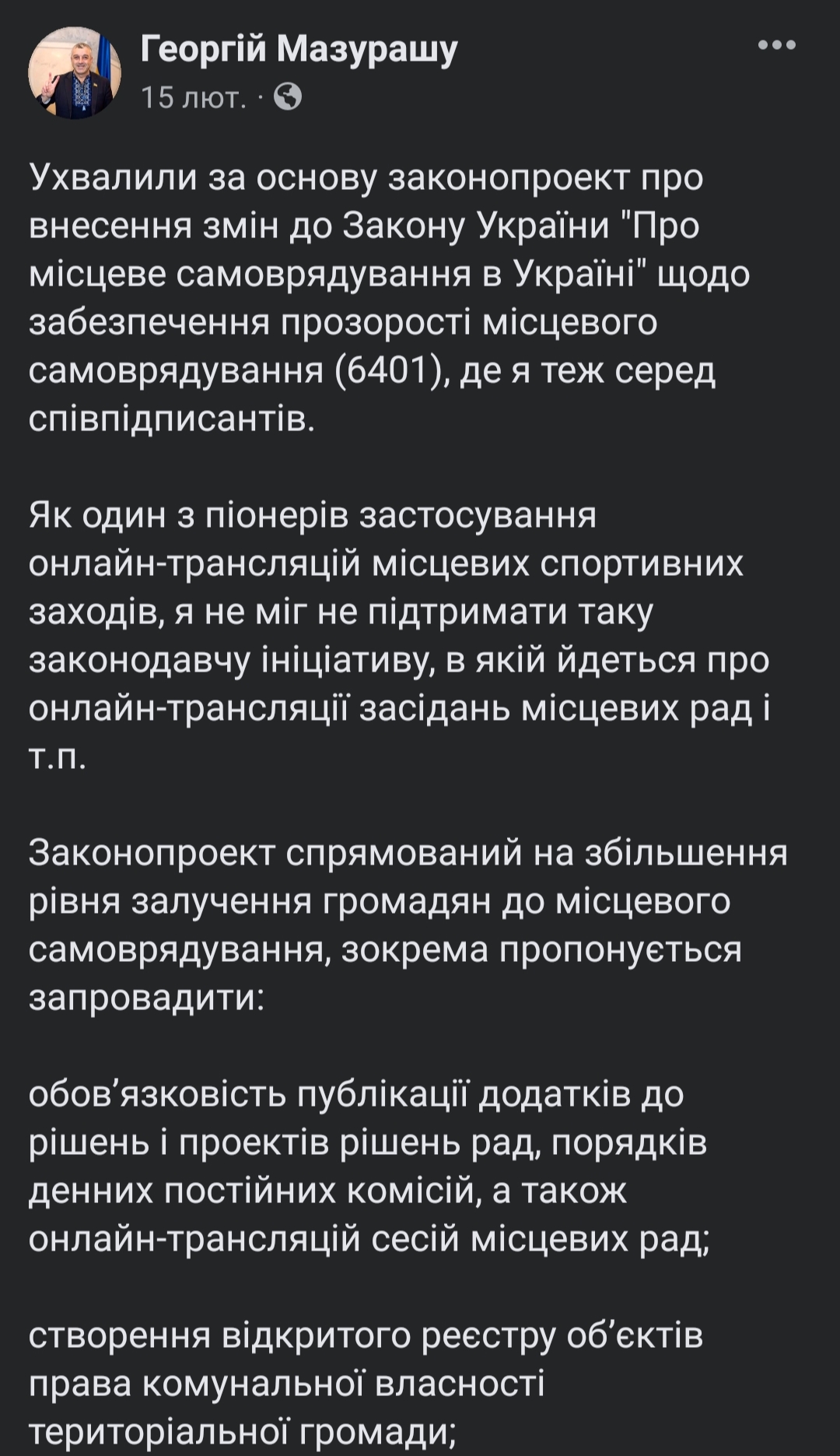 - Законопроєкт №6401 про внесення змін до Закону України «Про місцеве самоврядування в Україні» щодо забезпечення прозорості місцевого самоврядування. Депутат запропонував суттєво розширити норми про відкритість місцевих рад і виконкомів громад. В законопроєкті йдеться про створення відкритого реєстру об’єктів права комунальної власності територіальної громади, закріплення обов’язку трансляції в режимі реального часу, запис та безстрокове зберігання запису засідання ради.