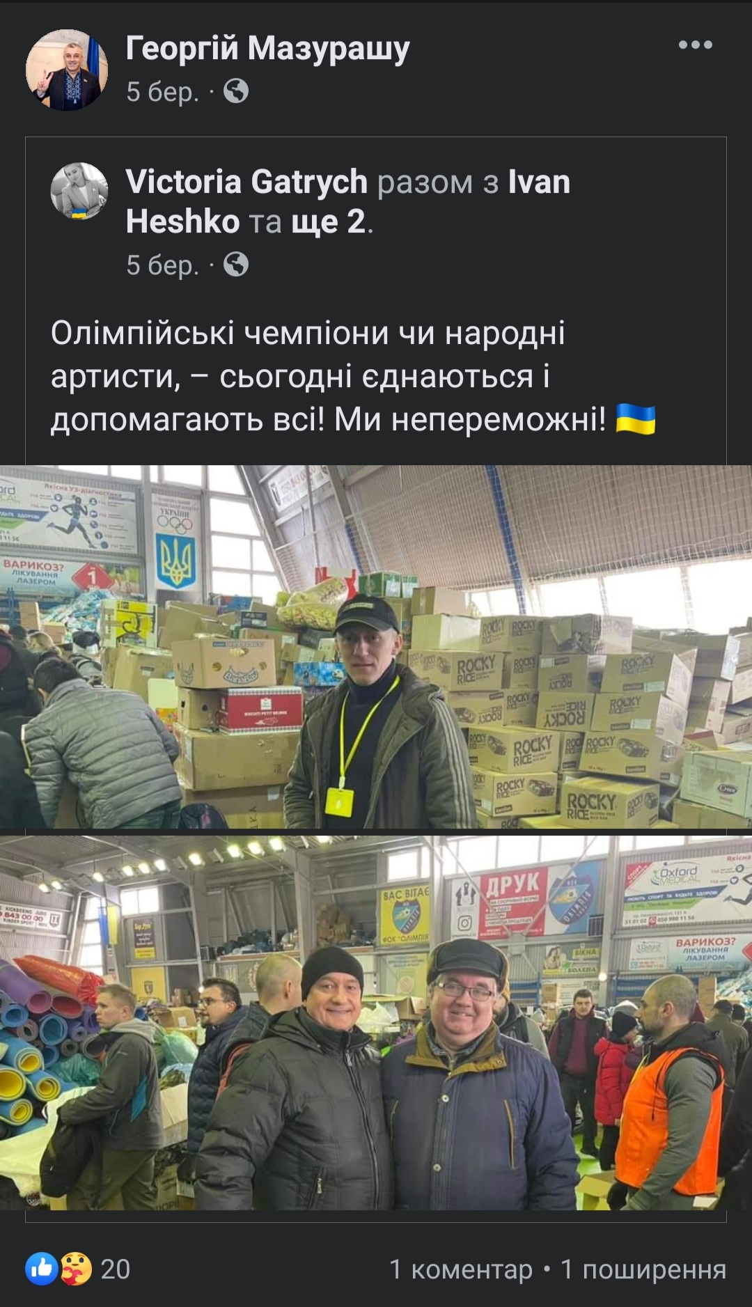 Наприклад, 5 березня народний обранець поінформував своїх підписників про те, як українські олімпійські чемпіони допомагають сортувати гуманітарну допомогу, 9 березня — про завоювання українськими спортсменами 2 медалей на Паралімпіаді, 22 березня — про свою онлайн-участь в засіданні Комітету ВРУ з питань молоді і спорту, а також про пошкоджені об’єкти молодіжної інфраструктури, 23 березня — про виключення зі складу збірної України з фігурного катання ексросіянки Шаботової тощо. Інформації про те, що Георгій Мазурашу допомагав у проведенні турнірів чи змагань, на його сторінці немає.