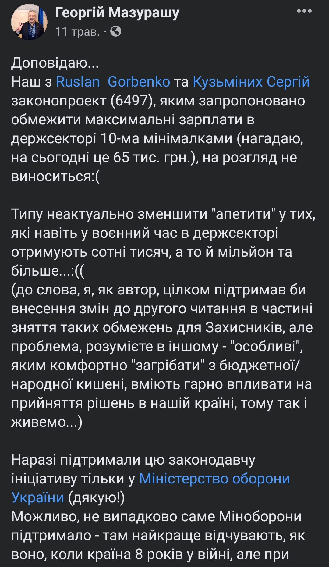 - Законопроєкт №6497 про внесення змін до деяких законодавчих актів України щодо захисту національних інтересів у державному секторі. Депутат запропонував обмежити максимальні зарплати в держсекторі 10 мінімалками.